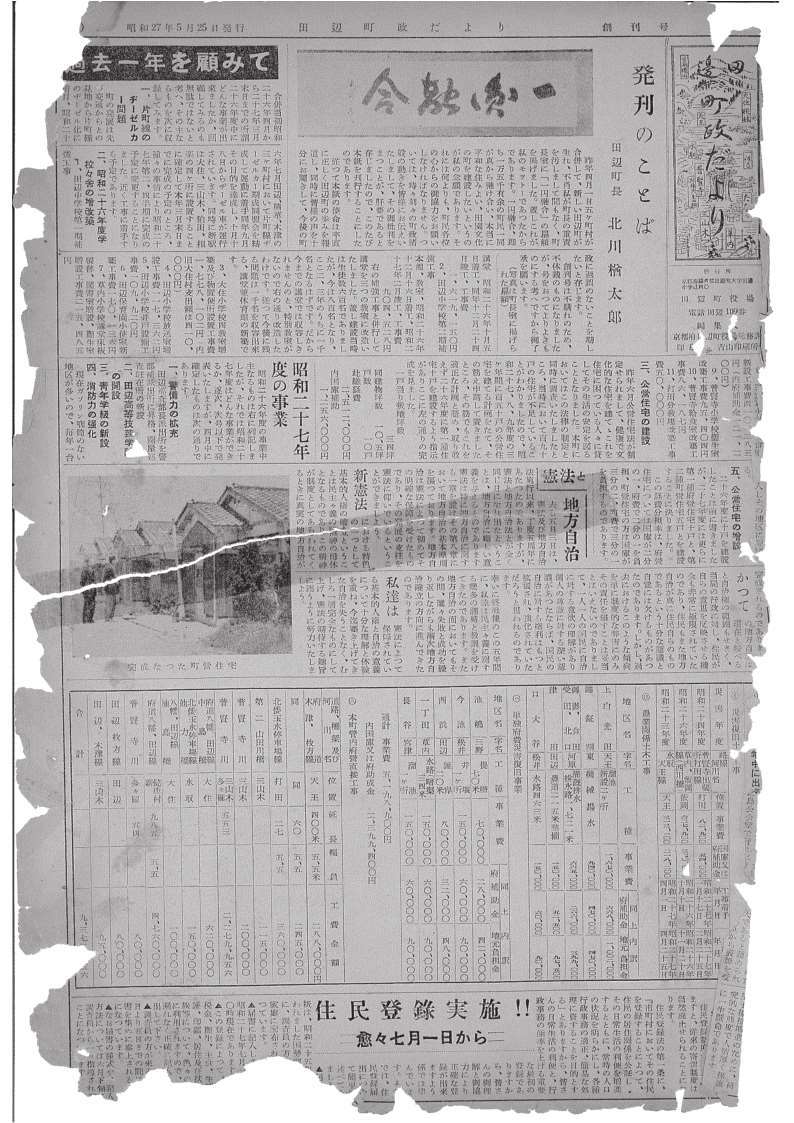 昭和26年には田辺保育所が開設され、昭和27年にははじめての町営住宅(関屋団地・10戸)が建設され、同年には『田辺町政だより(現広報ほっと京たなべ)』が創刊されるなど、現在の京田辺市の基盤が整備されていきました。