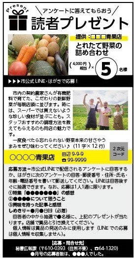 「読者プレゼント」は、広報紙を読んでアンケートに回答すると、抽選で市内のお店の商品・サービスの引換券が当たる広報紙の人気コーナーです。