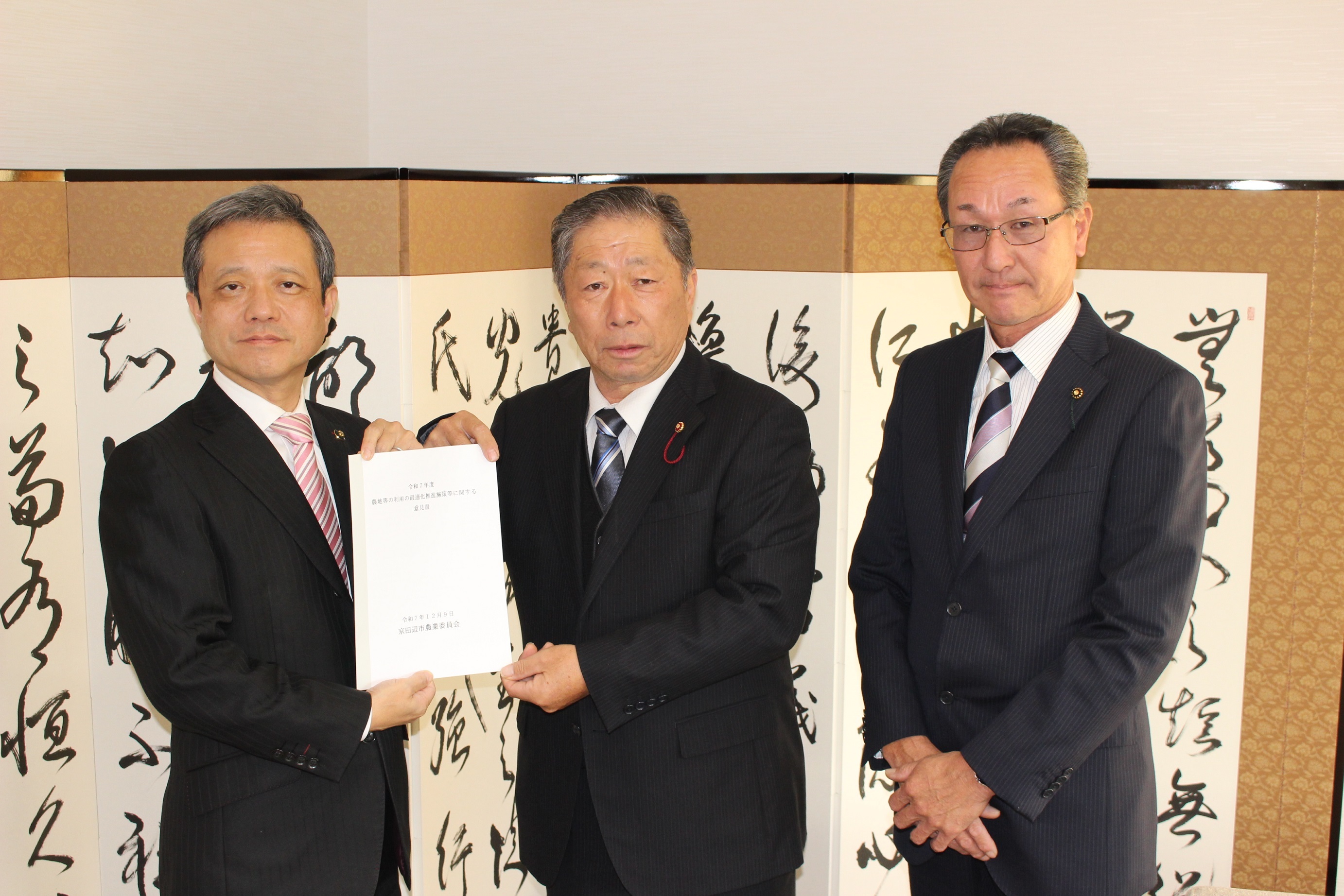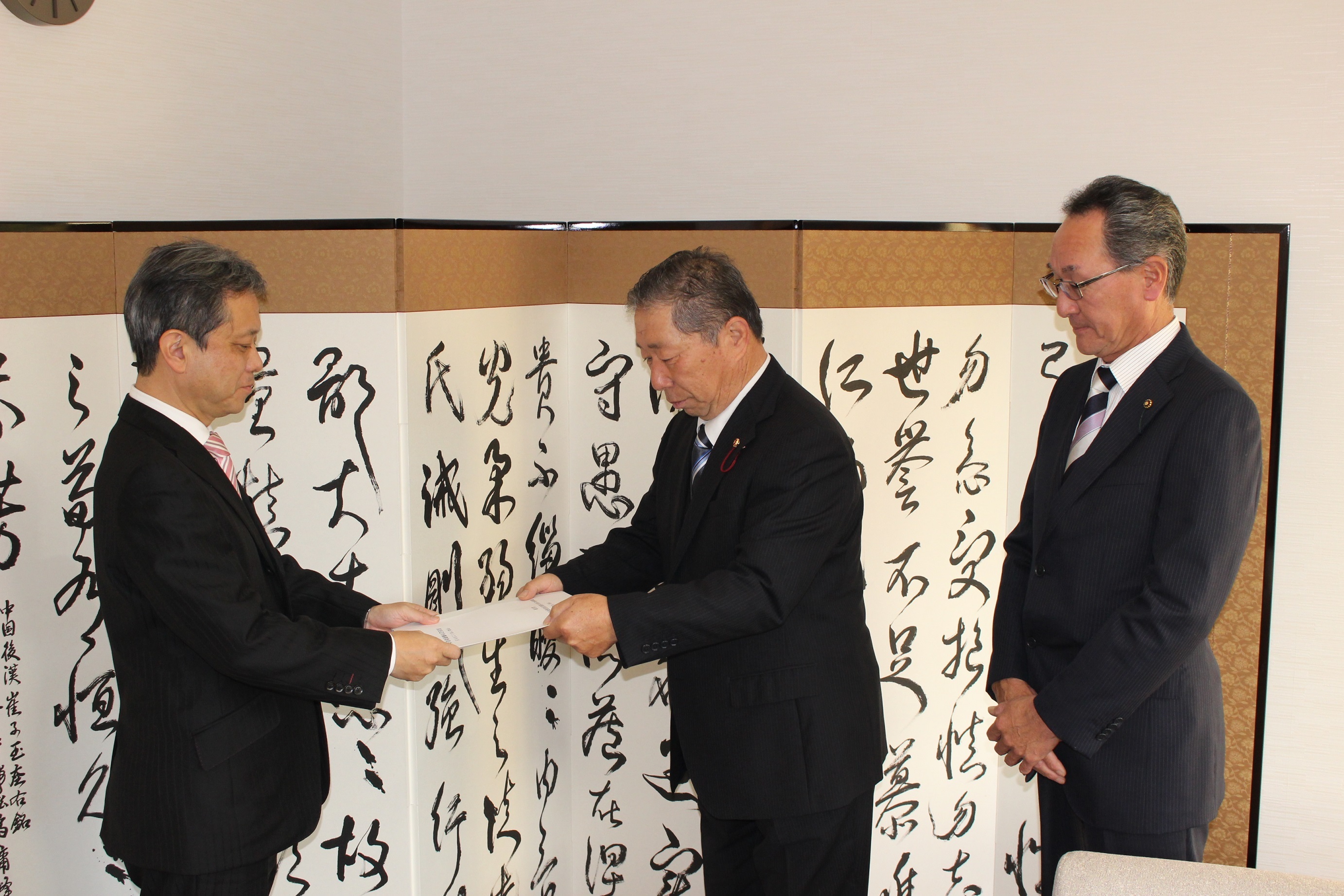 上村市長(左)に意見書を提出(中央・澤田会長、右・米田会長職務代理者)