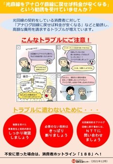 「光回線をアナログ回線に戻せば料金が安くなる」という勧誘にご注意ください-事業者名や契約内容をしっかり確認! アナログ回線に戻す手続きはご自身でも可能です- (別ウインドウで開く)