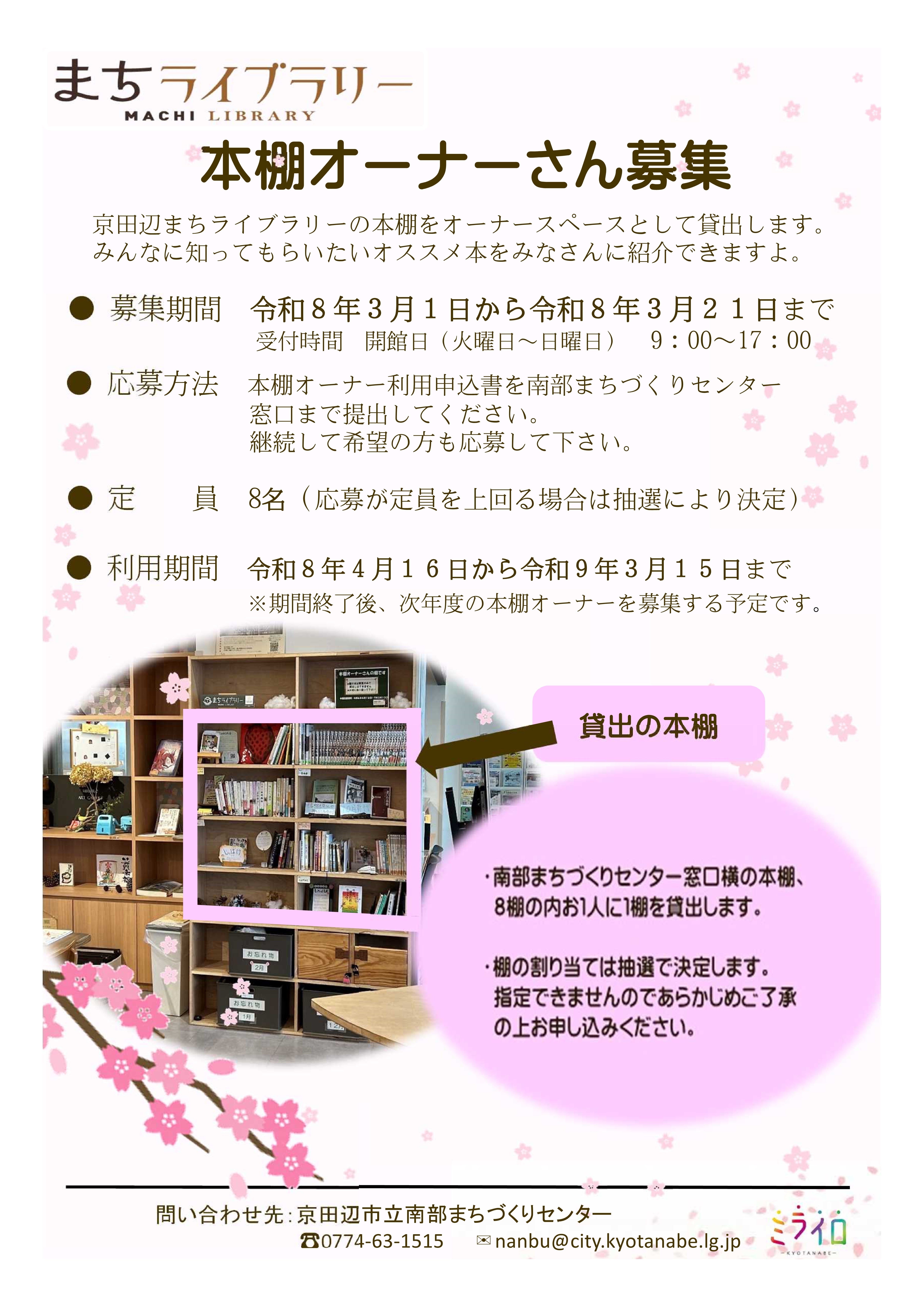 京田辺まちライブラリーでは令和8年度の本棚オーナーさんを募集します。