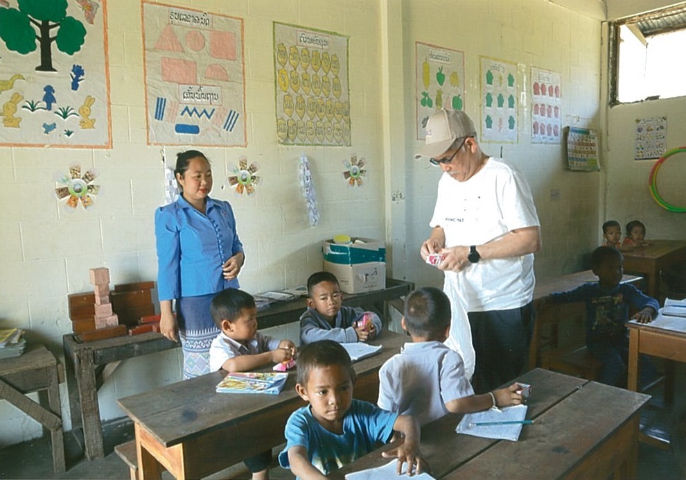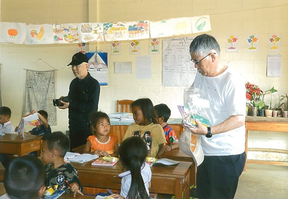 ボランティアコスモスとして、週1回の九十九園での喫茶で積み立てたお金や子ども服、日用品(歯ブラシ、ヘアブラシ)などを携えて、ラオスを訪問しました。ナンバーク郡にある小学校で、以前、ボランティアコスモスが建設資金を出した校舎の状況を視察したり、ナハム村では、村の人たちとカレーを炊き出しして、一緒に食べて交流しました。また、現地で購入した文房具などとともに衣服や歯ブラシなどを配布し、小学生たちと交流しました。