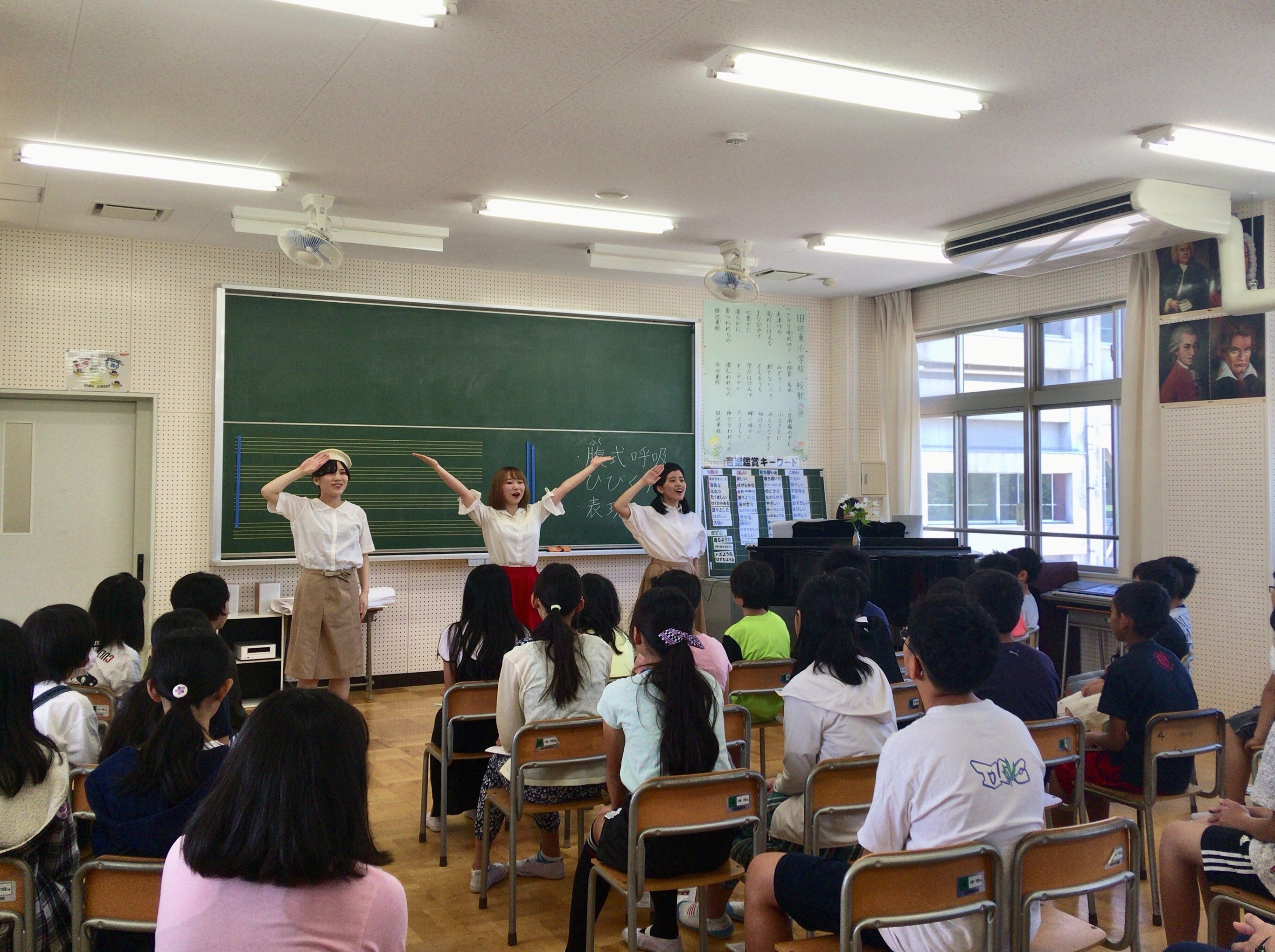 これらの授業を通して、子どもたちは、声楽を専攻する学生の生演奏を聴いて学ぶことができ、また、学生は鍛錬の成果を学外で発揮して子どもたちの反応を間近で見て学ぶことができました!