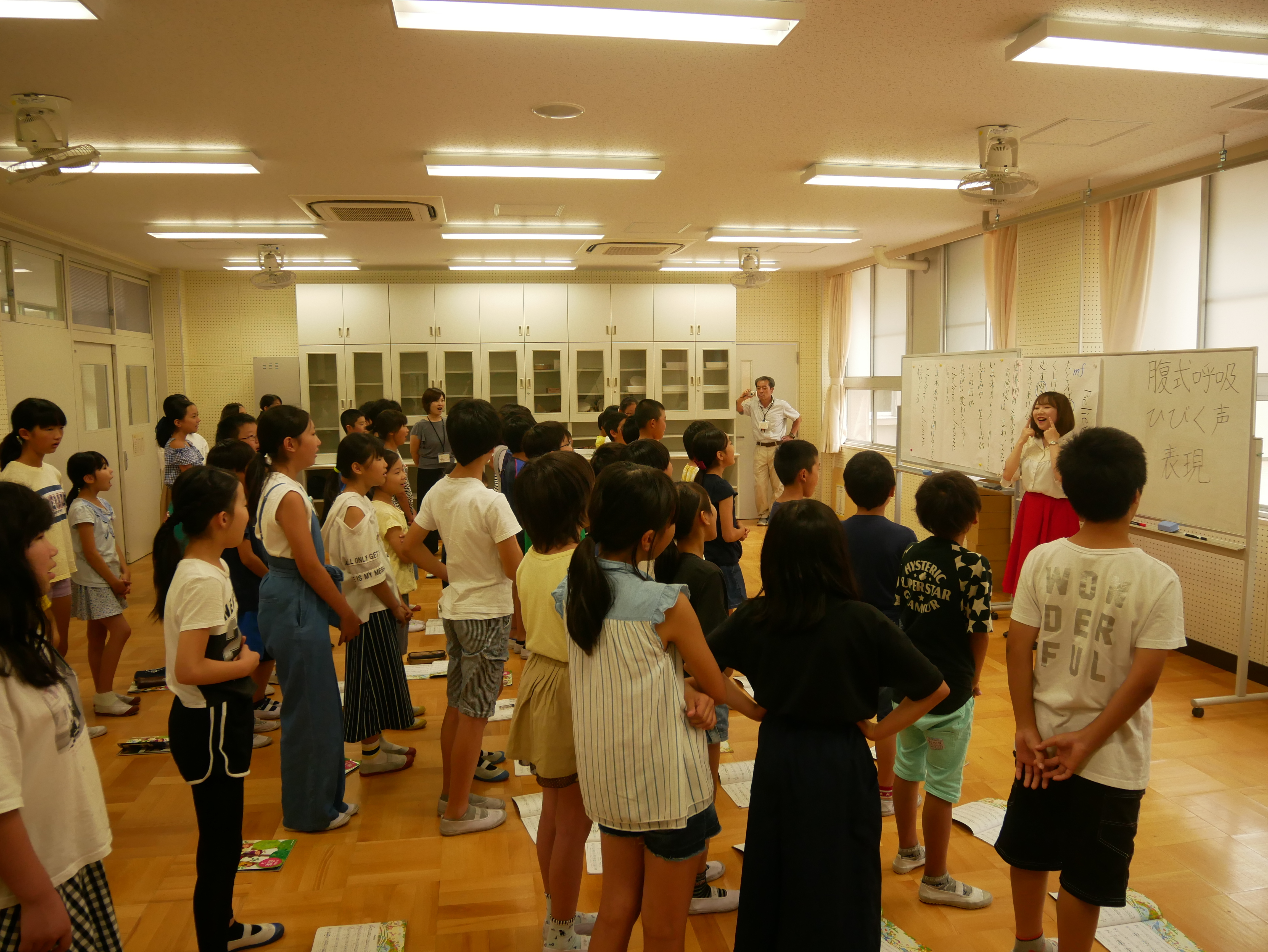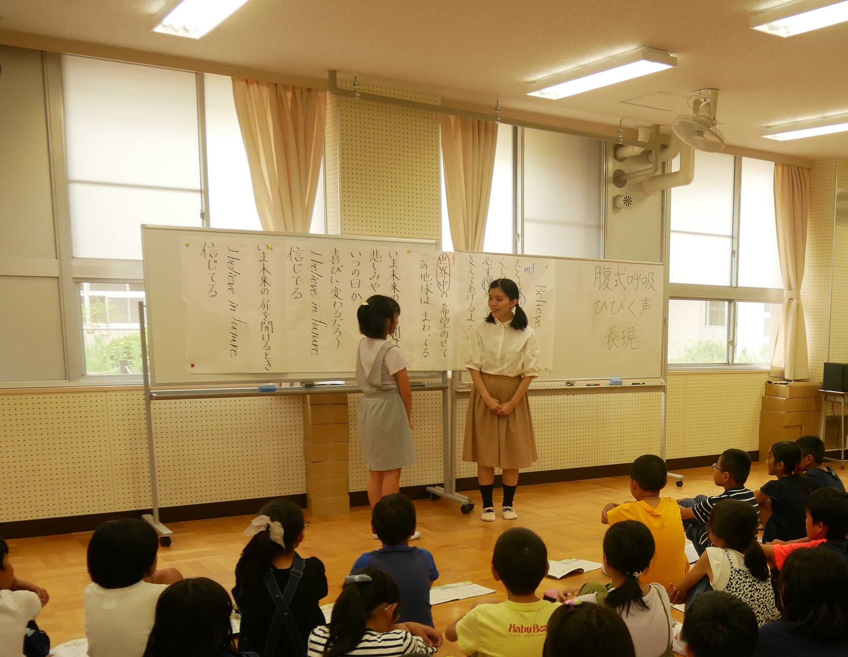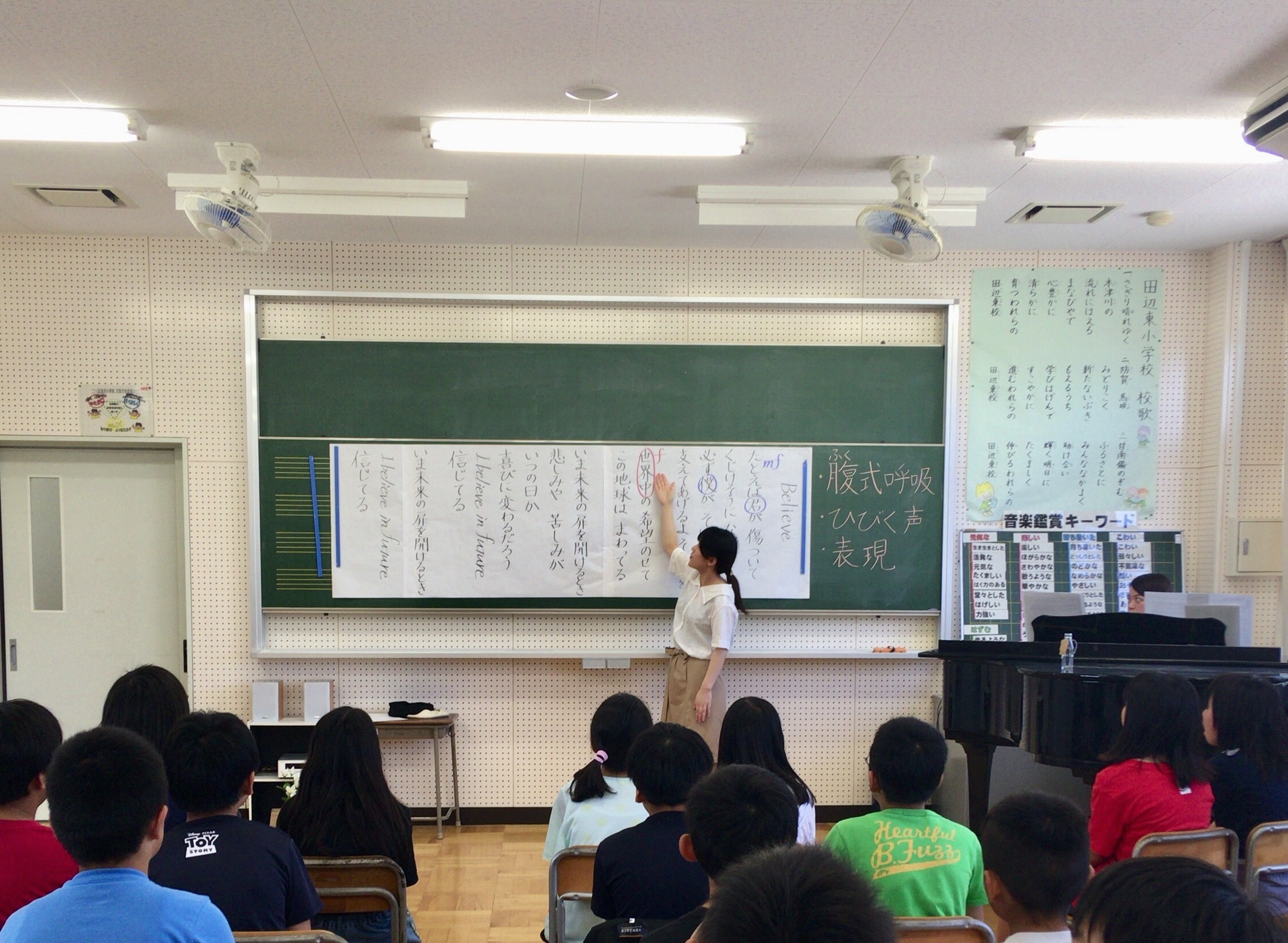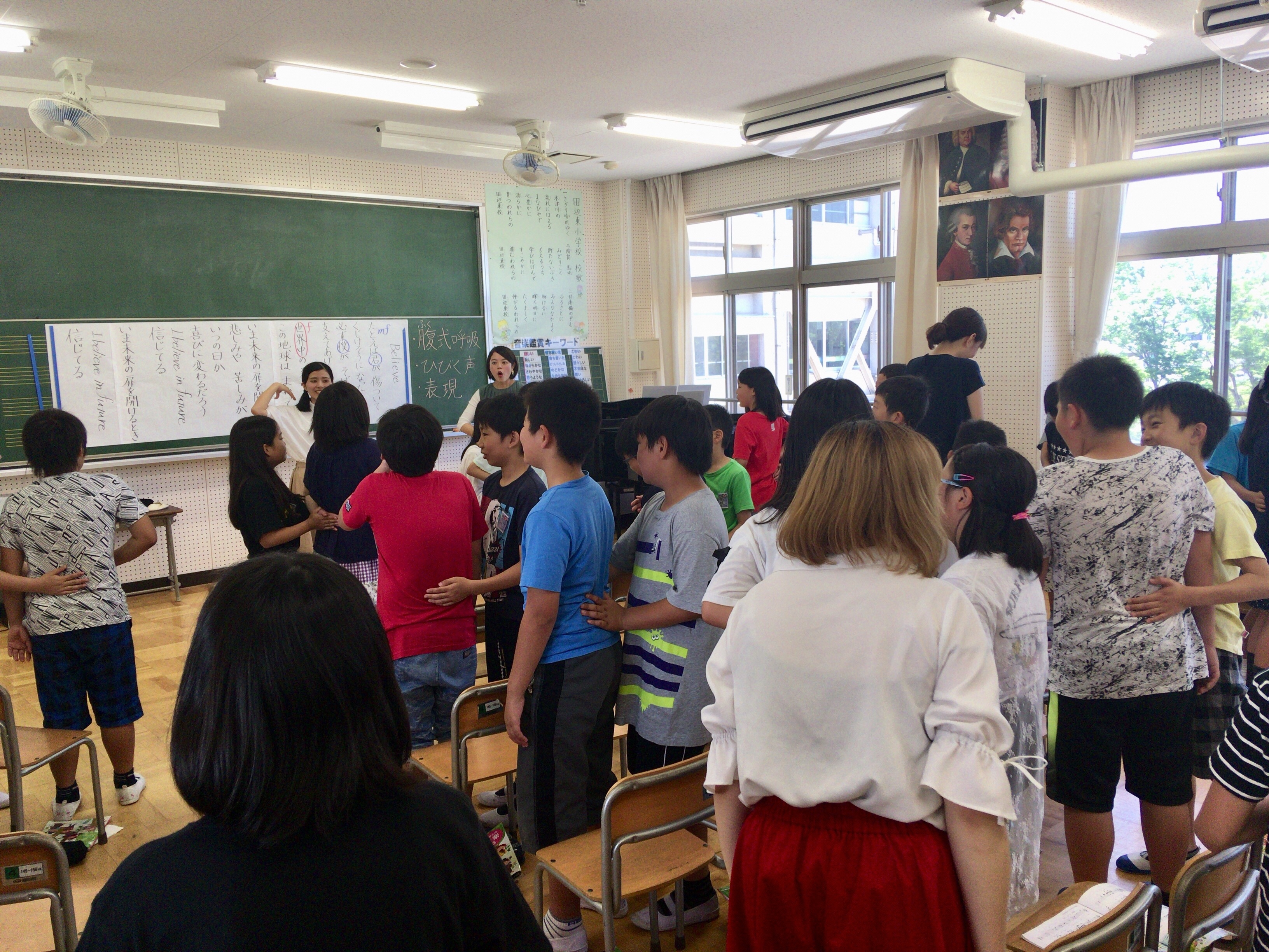 小学校の授業は、「サウンドオブミュージック」のミュージカルから始まり、学生は「ドレミの歌」や「エーデルワイス」の二重唱を披露しました。その後、「今日は歌うことの楽しさ、音楽の素晴らしさを学んでほしいです!」と児童に伝え、「腹式呼吸、ひびく声、表現」をテーマに、歌唱曲の指導を行いました。