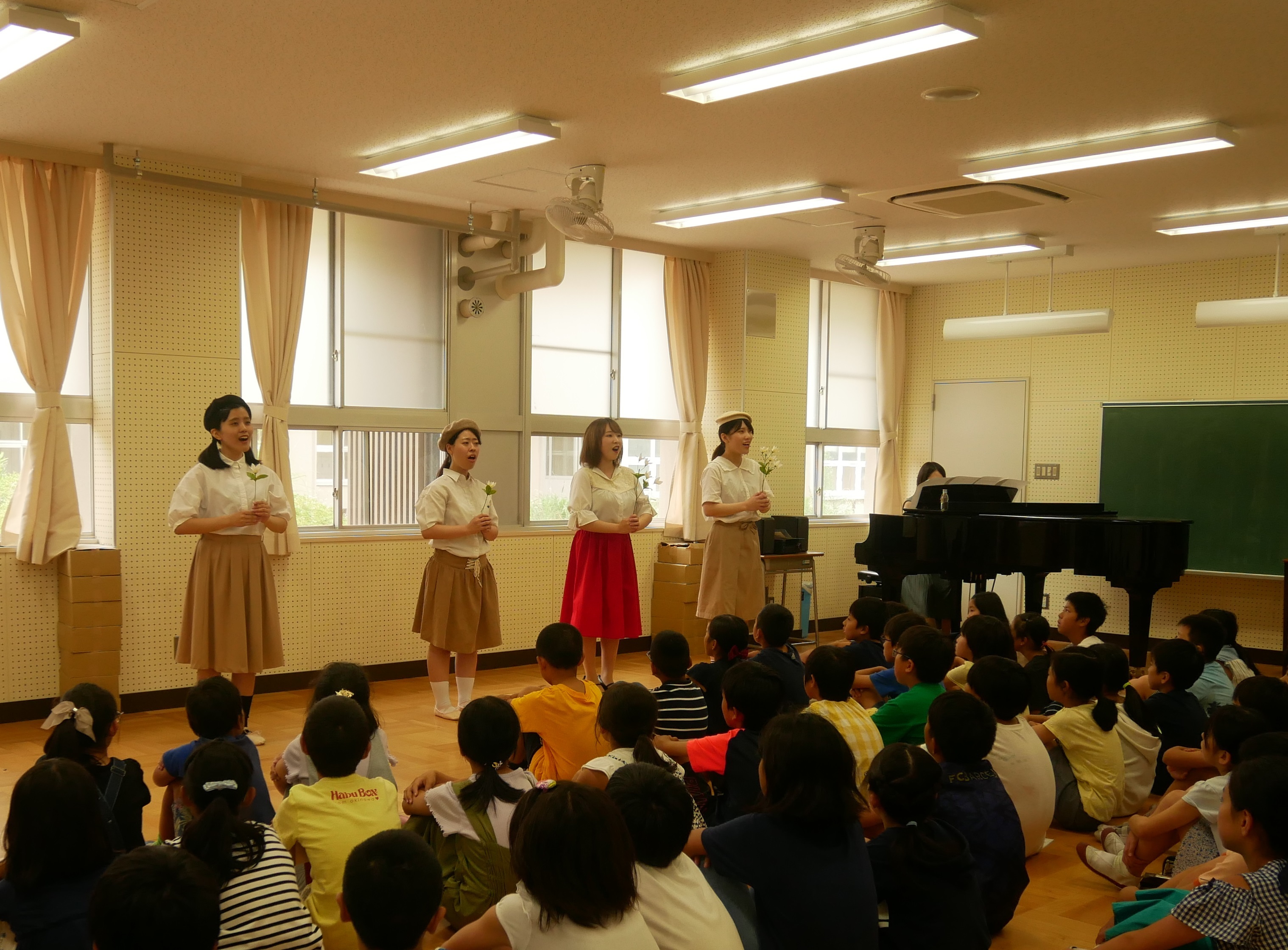 小学校を訪問したのは、大学で授業「音楽によるアウトリーチ」を履修する学生5名(声楽専攻4名、音楽文化専攻1名)です。アウトリーチ活動とは、本来その活動(本科目の場合は音楽)が盛んではない、さまざまな教育・医療等の現場に赴いて、自分の専門分野の活動(この場合は音楽)を行い、その場に文化・芸術的理解をもたらし、交流を深めることを目的とします。