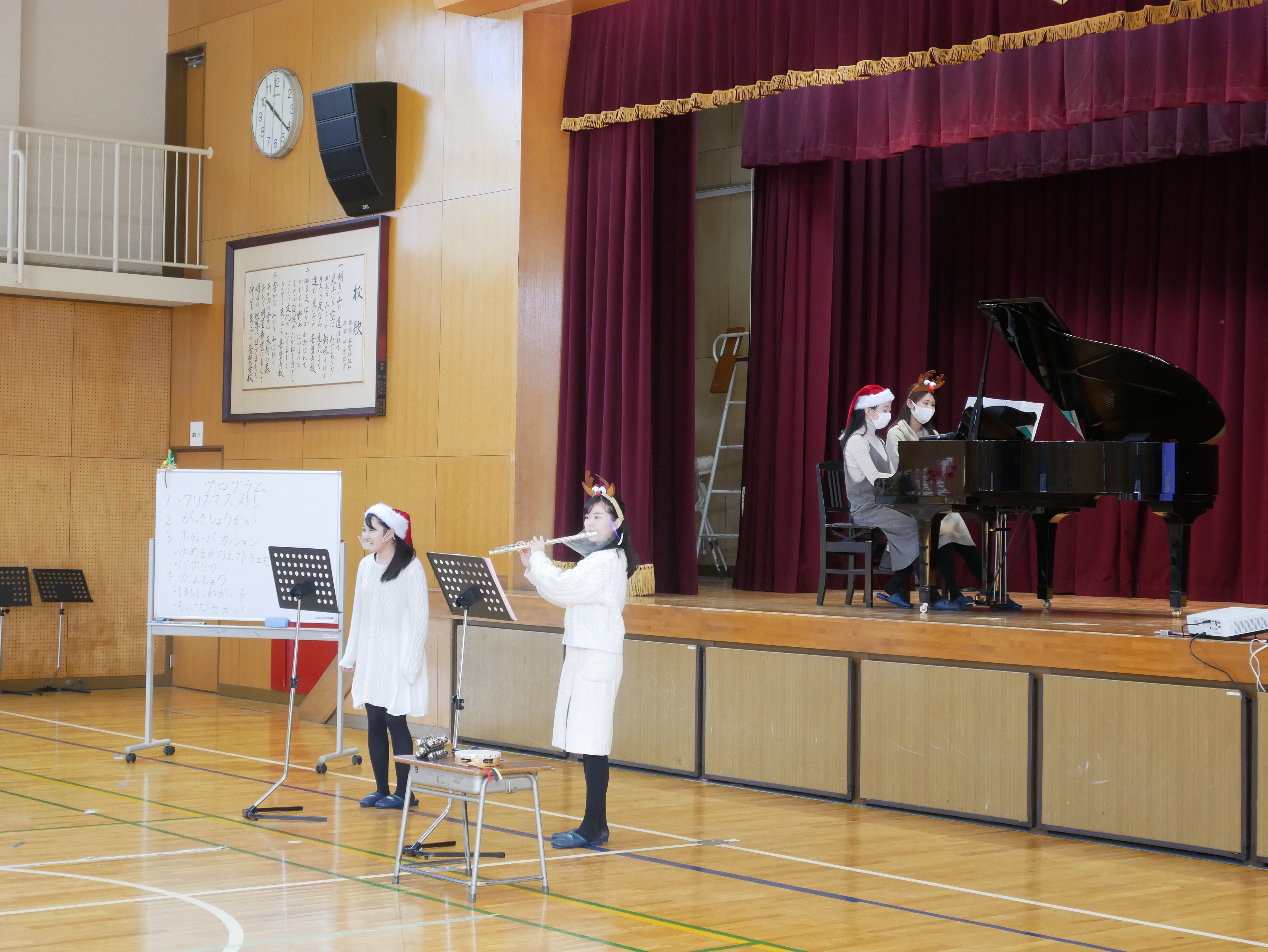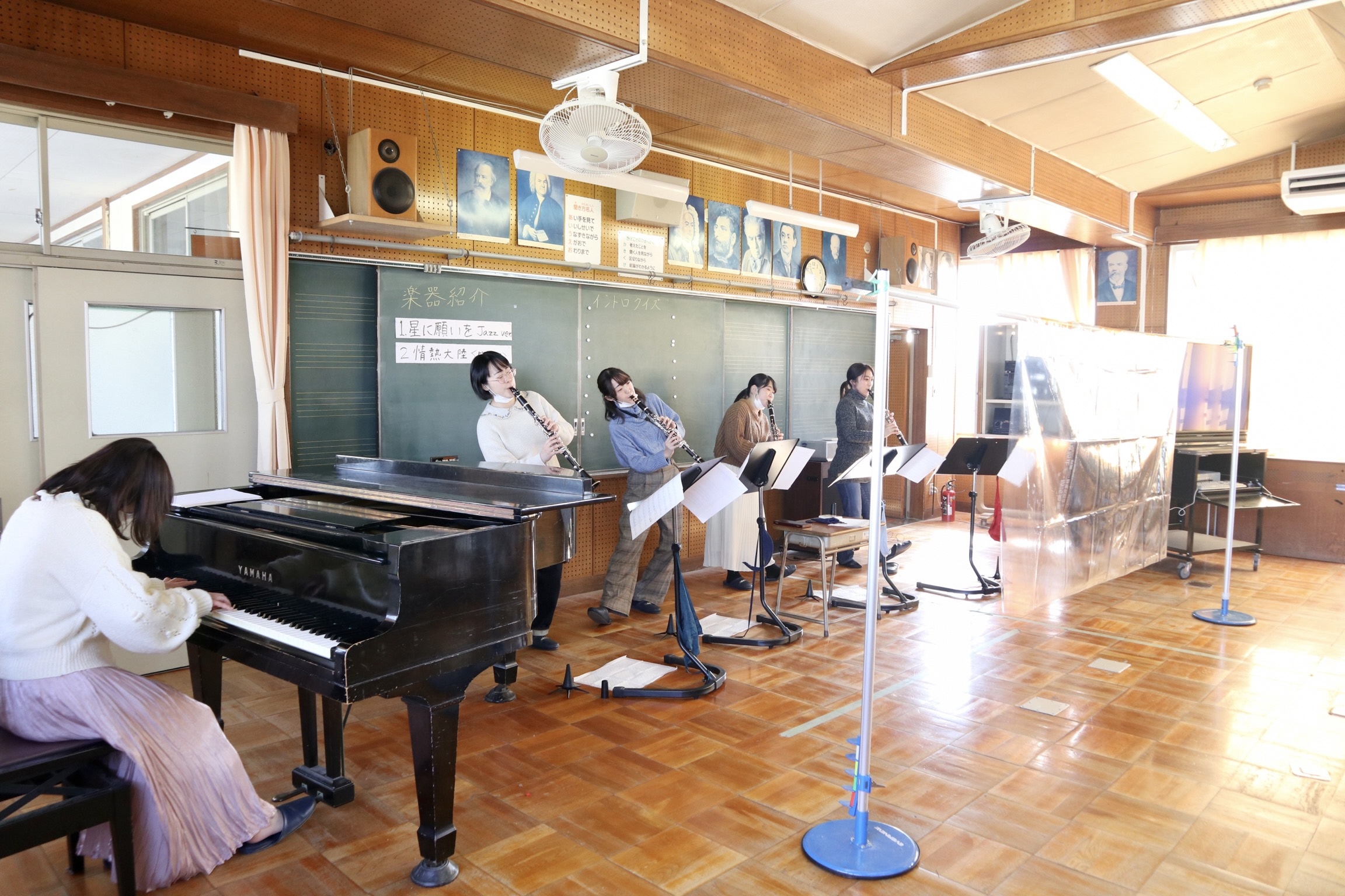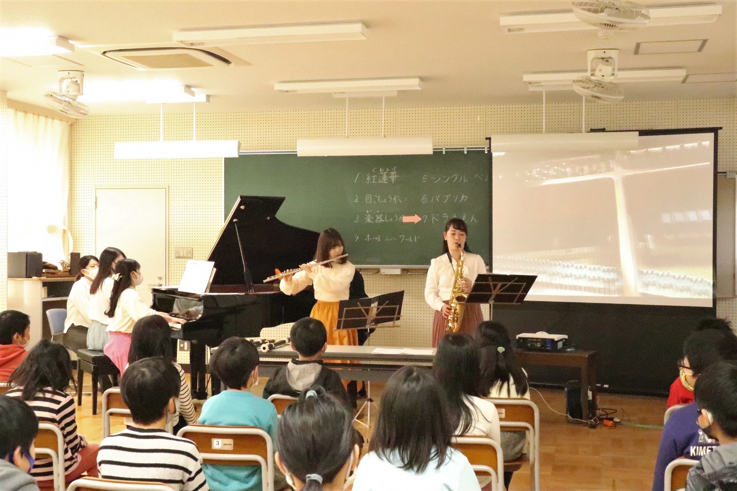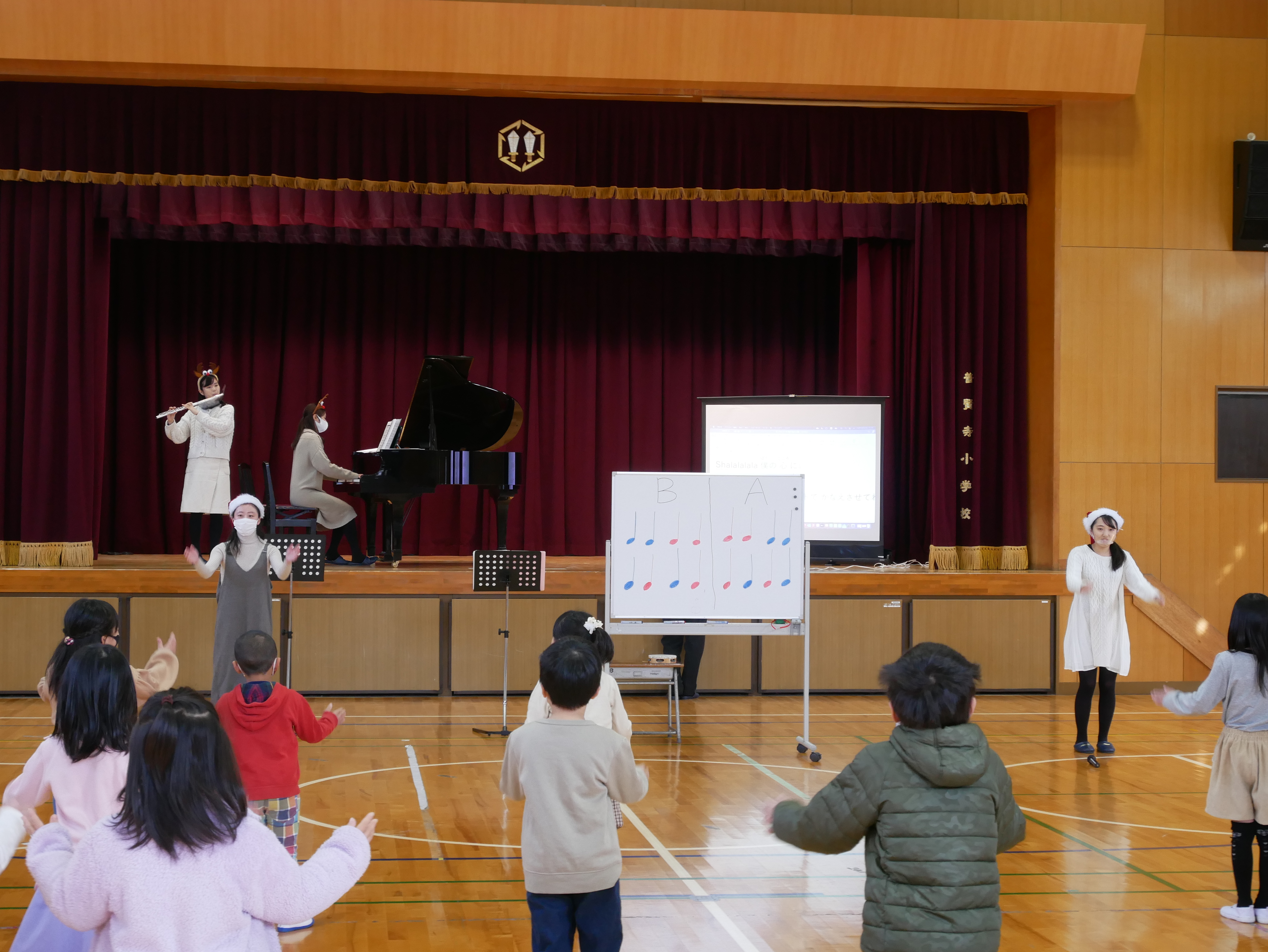 また、三山木小学校では、学生が授業の冒頭、アニメ「鬼滅の刃」の主題歌『紅蓮華』をフルート、サックス、ピアノで演奏して登場し、クリスマスにちなんだ音楽のリコーダー四重奏や『パプリカ』のピアノ連弾などを披露しました。各楽器紹介では「サックスという楽器の名前の由来は?」という3択クイズを実施したり、「1番小さなリコーダーは大人の手のひらサイズ!」と紹介を行うなど、児童が楽しく学べる授業プログラムでした。