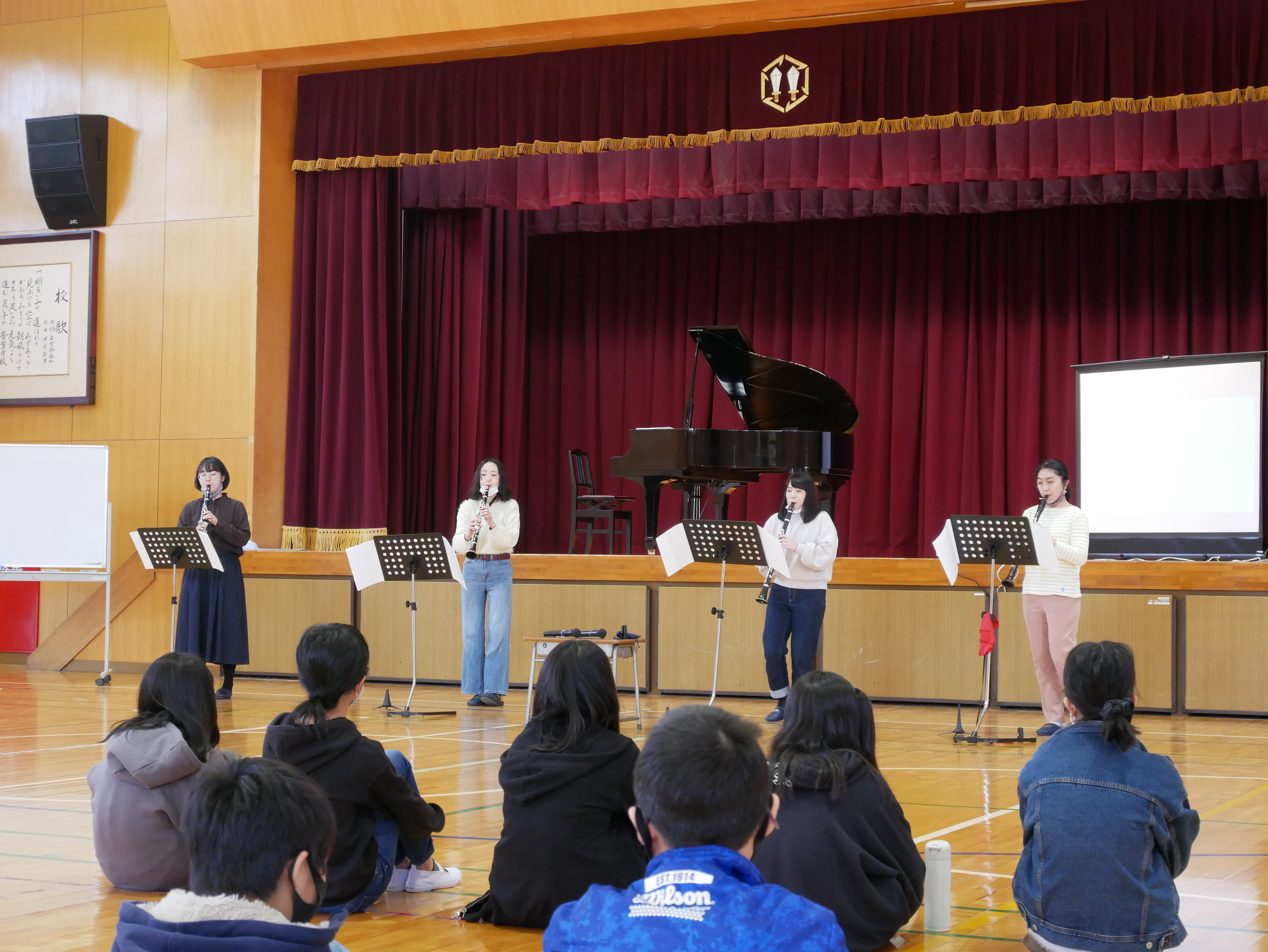 普賢寺小学校と草内小学校では、学生が、フルート、クラリネット、ピアノを使用して楽器紹介を行い、児童にも聴き馴染みのある楽曲の演奏を披露しました。クラリネット四重奏による「イントロクイズ」では、児童は音楽に集中し、曲の冒頭が演奏されると元気に「はいっ!分かったー!」と競って手を挙げ、正解後に楽曲のフル演奏を鑑賞しました。また、学生の演奏する『パプリカ』に合わせて、身体を楽器のように叩いてリズムを奏でる「ボディーパーカッション」にも挑戦しました。