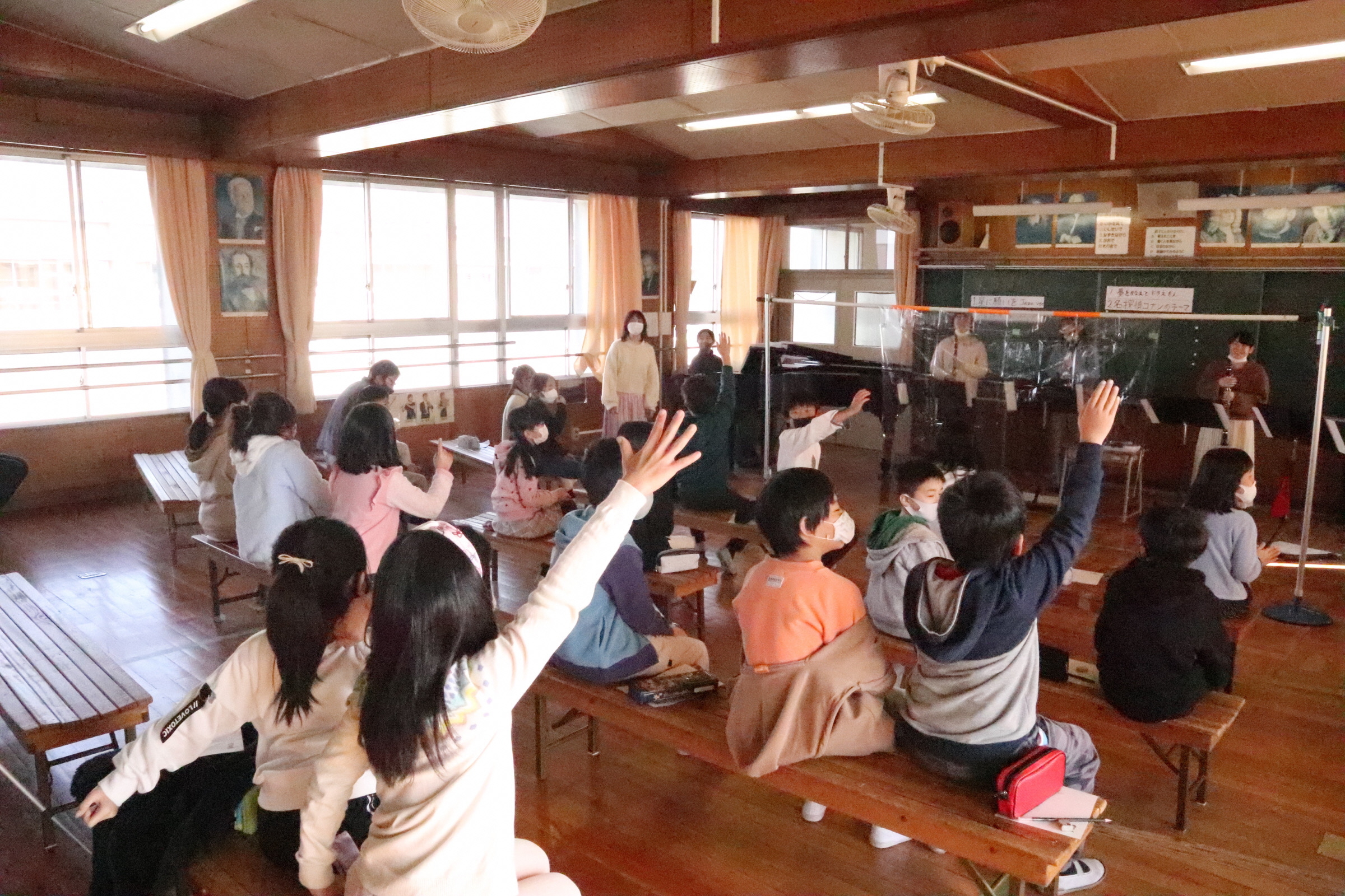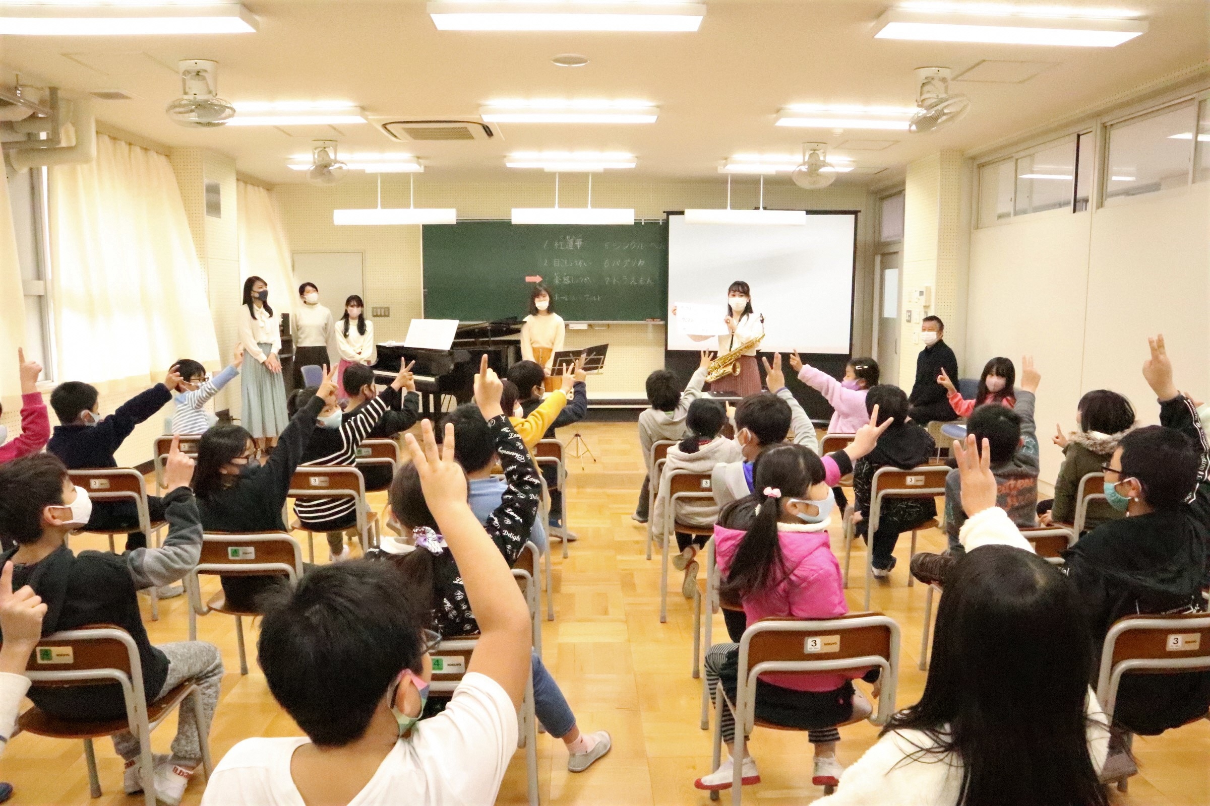 授業後、児童から「演奏する時に気を付けていることはなんですか?」という質問があり、学生は「『音楽』という漢字は『学』ではなく『楽』と書くように、まずは自分が音楽を楽しむことを大切にしている」と回答し、児童にこれからもたくさんの音楽に触れて欲しいと伝えました。