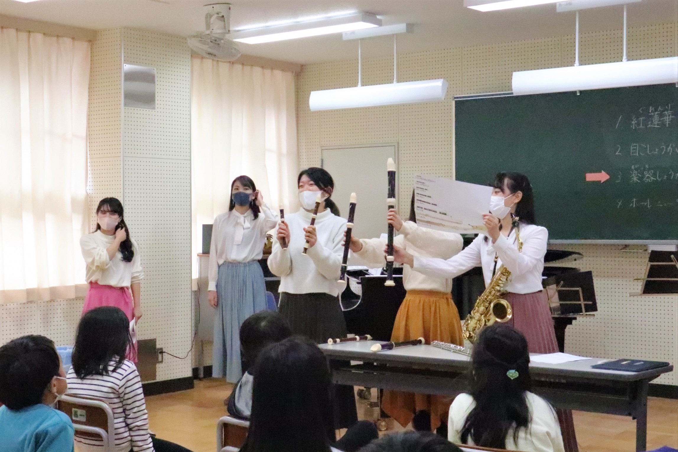 学生は、児童に「音楽の楽しさや楽器の仕組み、音色について学んでもらいたい」と授業プログラムを計画し、今年は、コロナ禍の影響もあり、学生は楽器演奏時以外マスク着用、児童も歌唱なしの授業となりました。