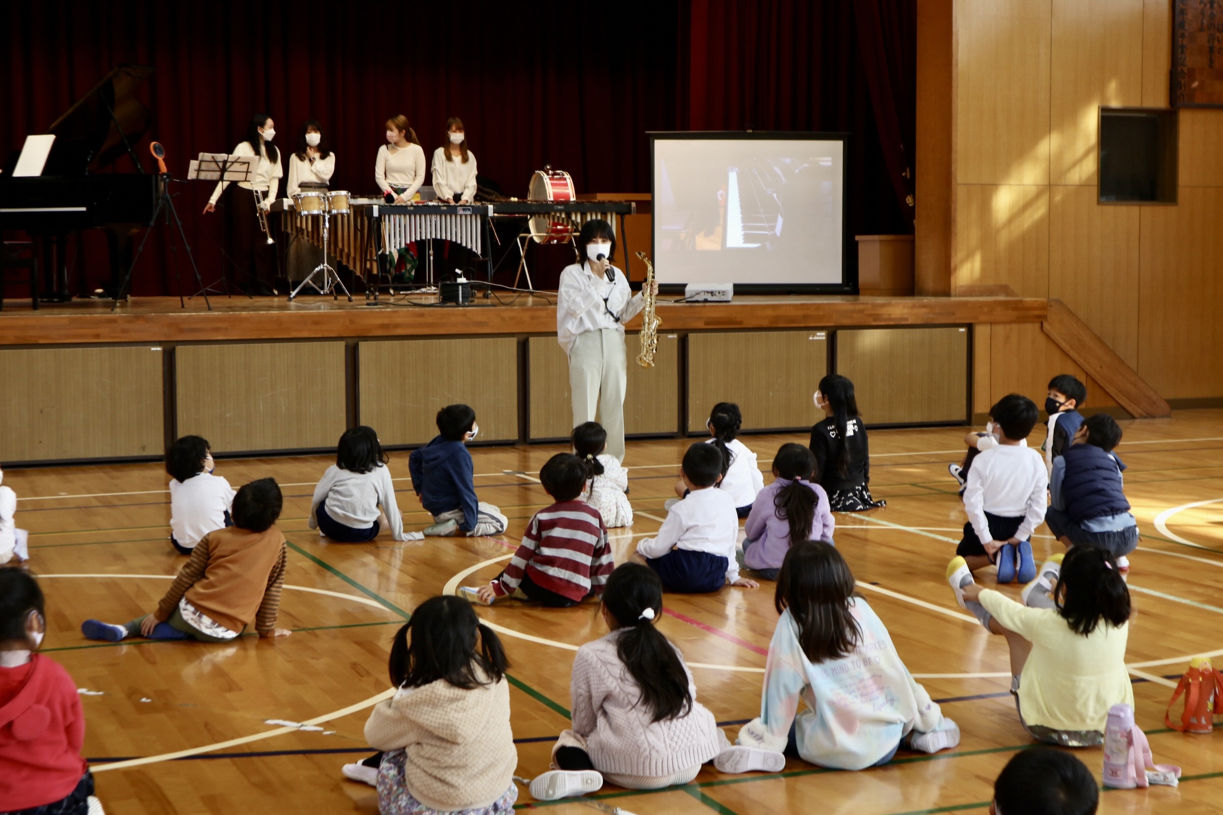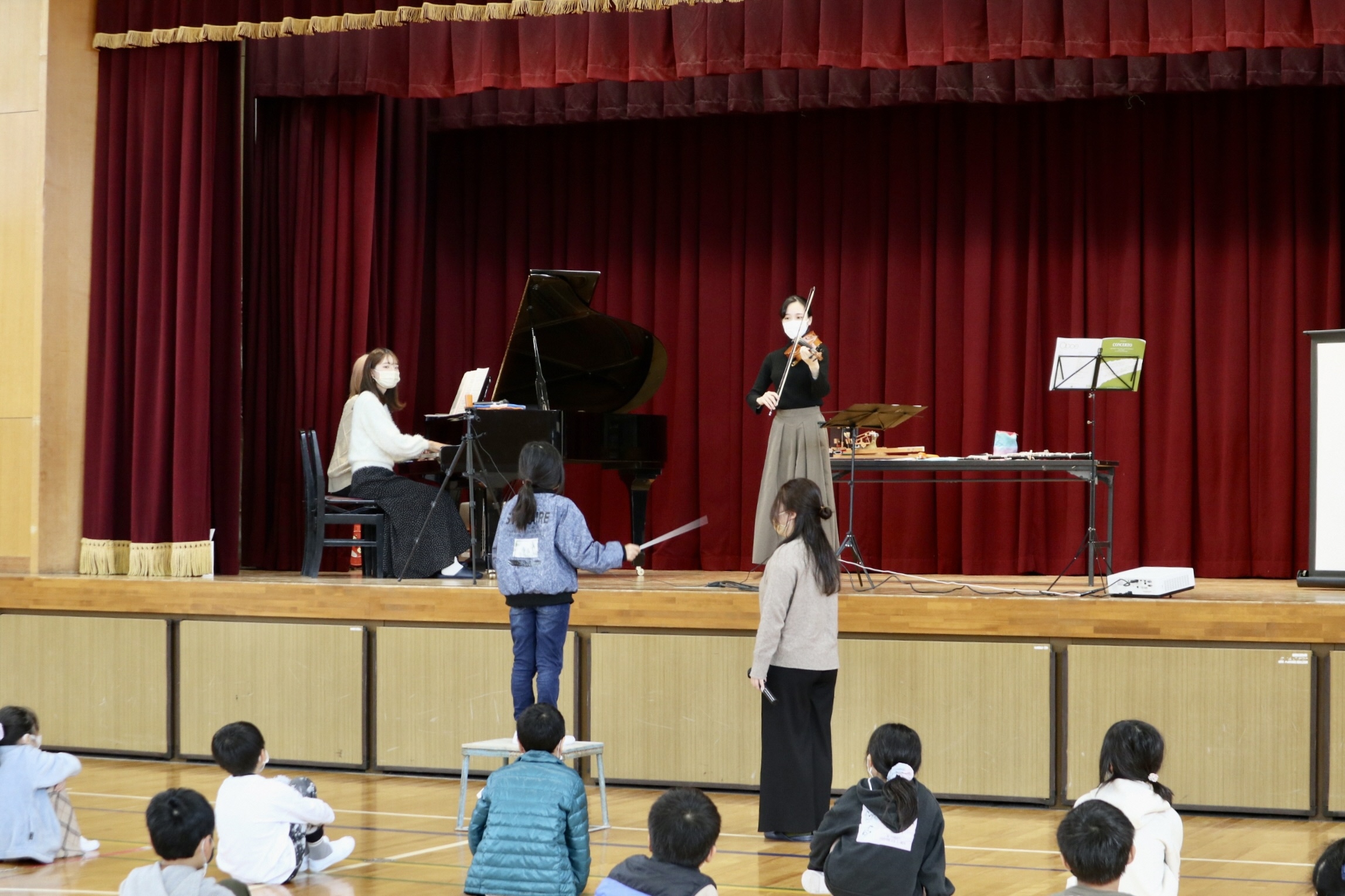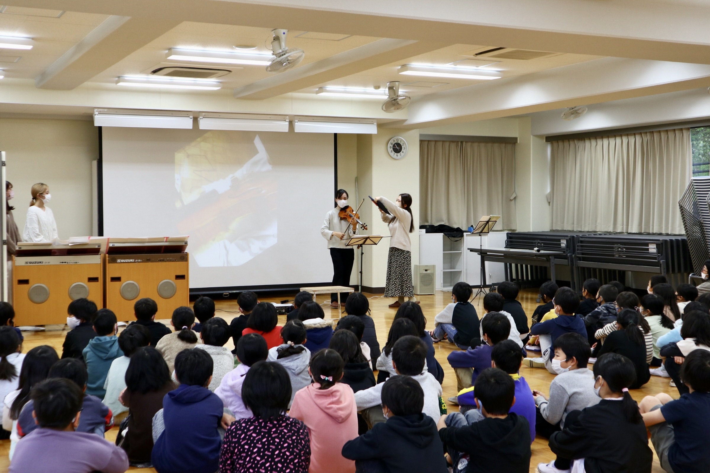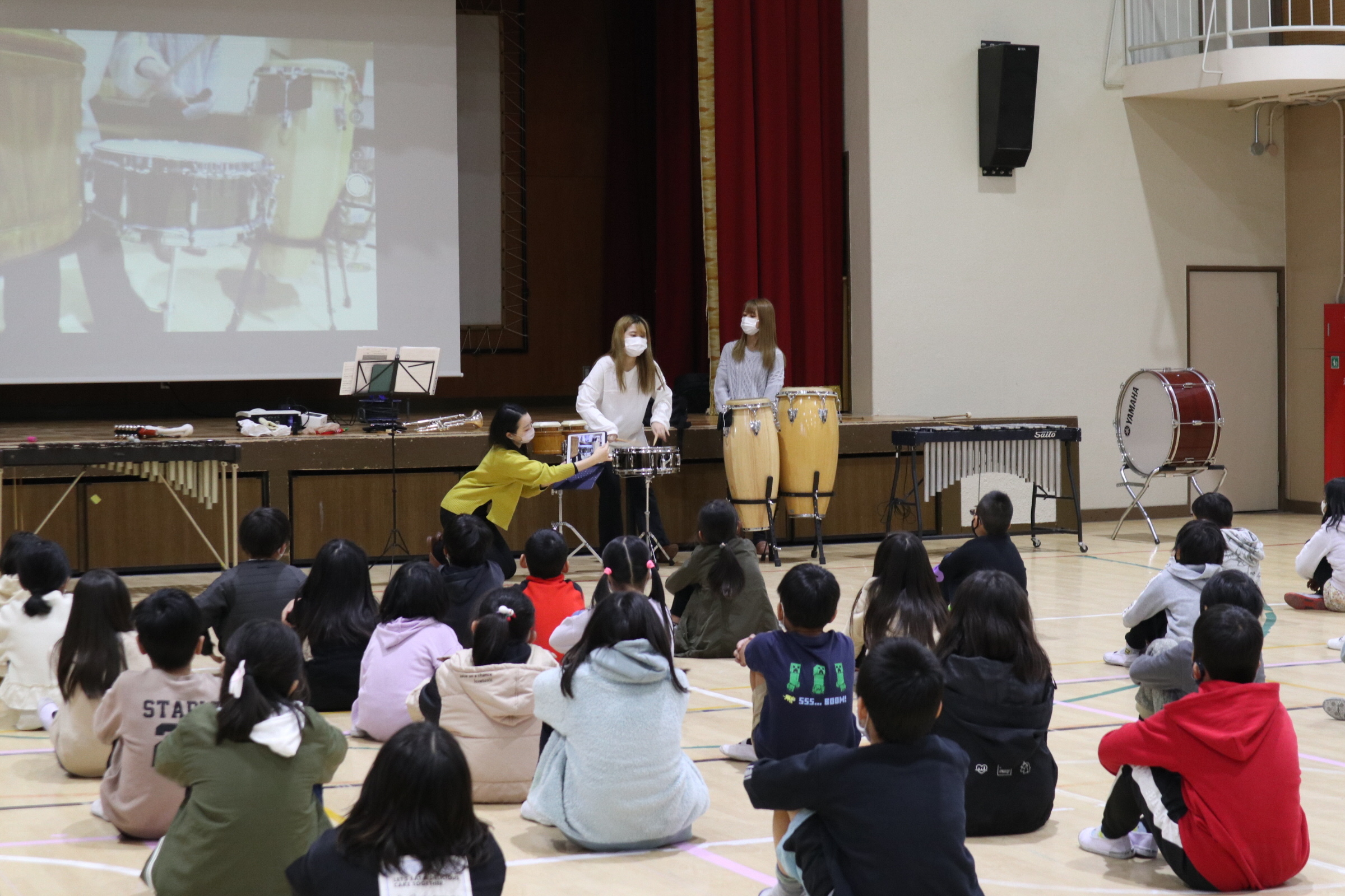 学生は、11月19日(金)の普賢寺小学校では、低、中、高学年の3グループに分かれ、12月17日(金)の三山木小学校では、3年生児童を対象に体育館と多目的室、音楽室の3会場に分かれ、児童に「様々な楽器や声楽の演奏に触れて、音楽の楽しさや楽器の仕組み、音色を知ってほしい」と公演プログラムを計画しました。