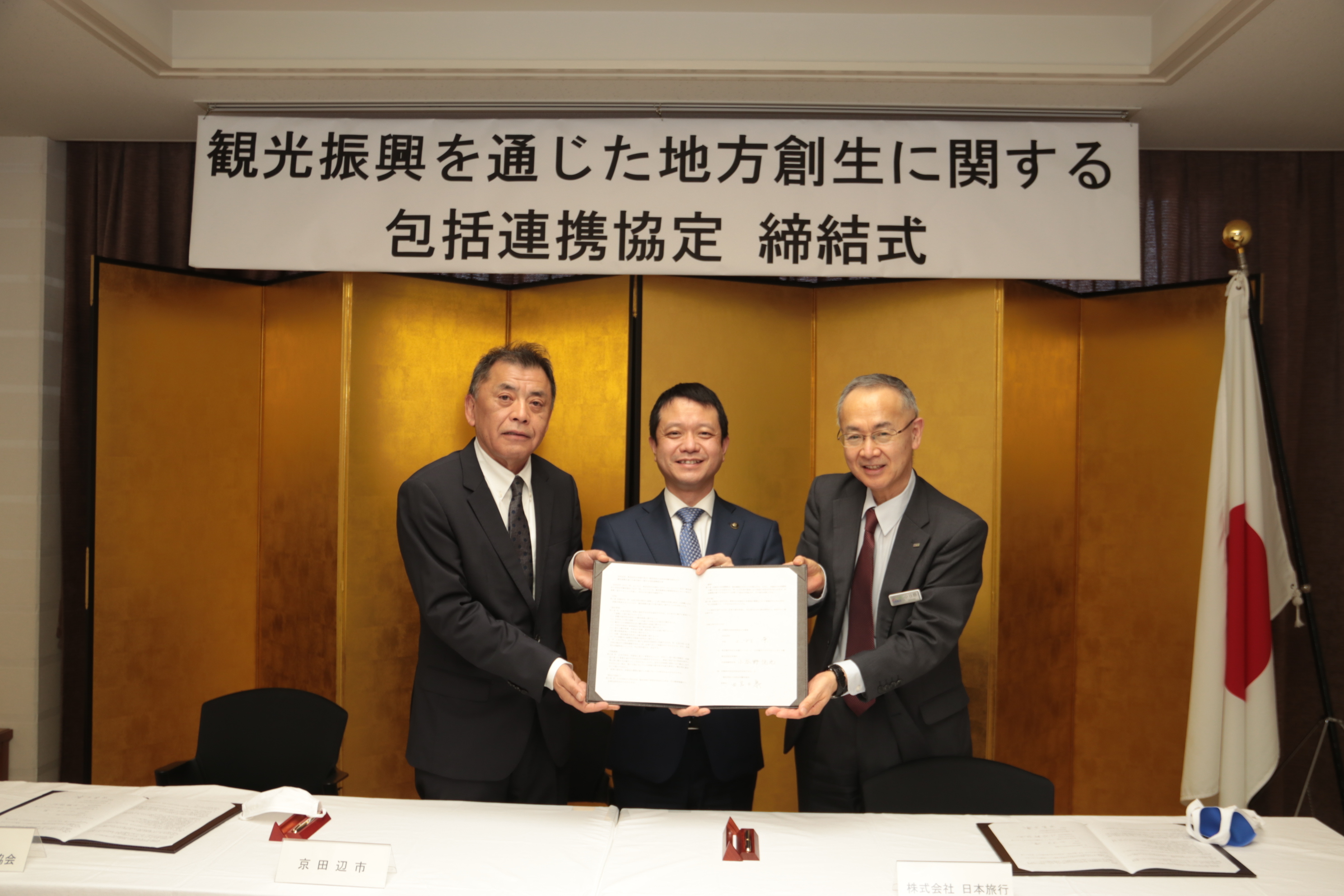 そこで、かねてより観光情報サイト「ココシル京田辺」の運用など、本市観光事業にご協力いただいており、豊富なノウハウを持つ株式会社日本旅行、一般社団法人京田辺市観光協会、そして本市が連携して、観光振興を通じた地方創生、地域活性化を進めるべく、この度の包括連携協定の締結となったものです。