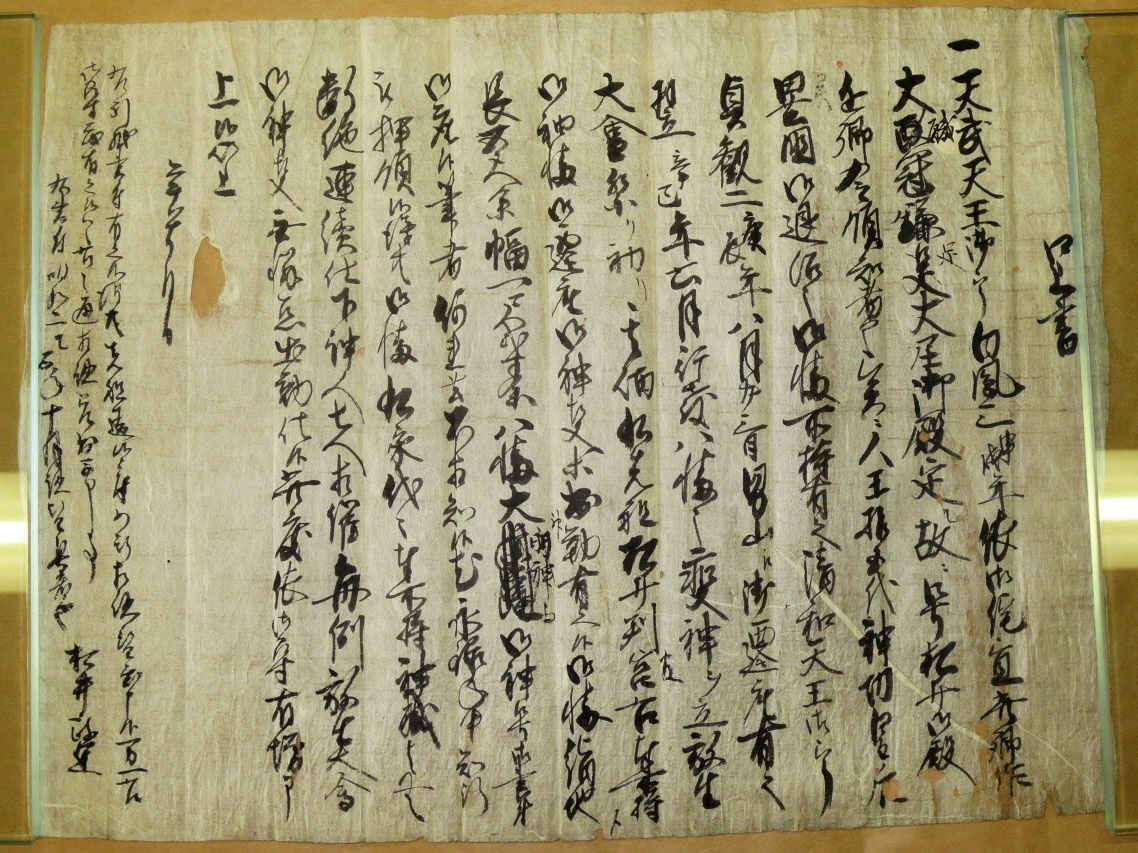 八幡宮長吏(ちょうり)(注3)の意を受けて、神人を奉行する役職である公文所と兼官が連名で発給した奉書(注4)。15日に放生会を執行すること、そのため13日から精進潔斎すること、14日の子の刻に神前に参勤することが通達され、放生会出仕の実態がうかがえる。