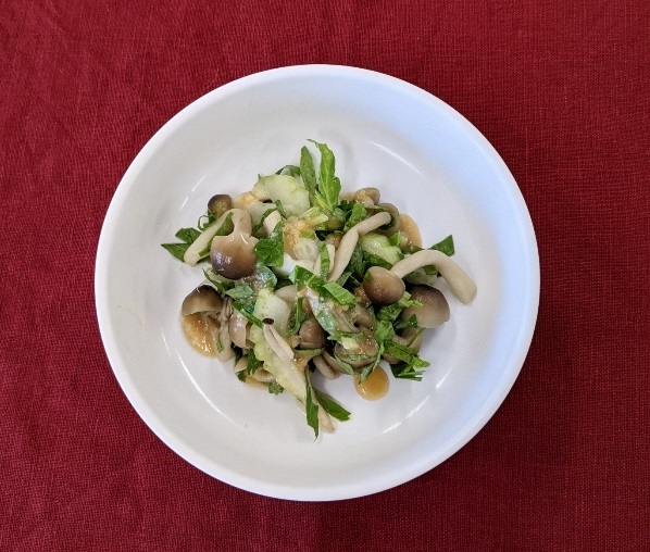 - セロリと、粗熱を取ったしめじに、Aを和えて器に盛る。