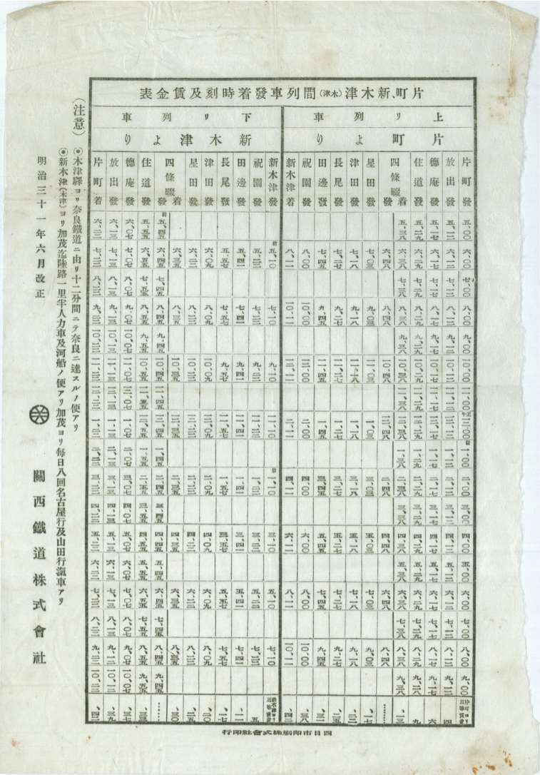 明治31年(1898年)の片町-新木津(木津)間の「列車発着時刻及賃金表」(京田辺市蔵)