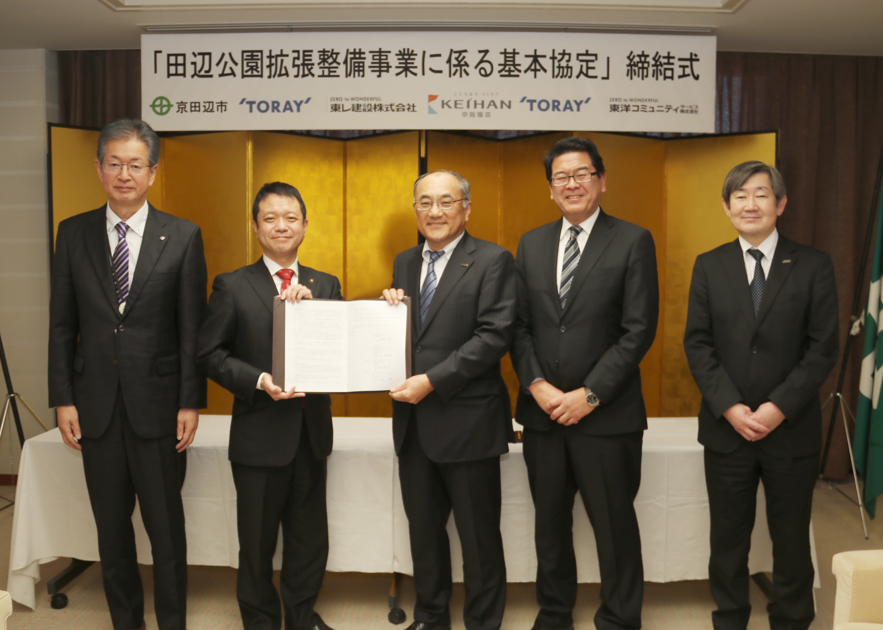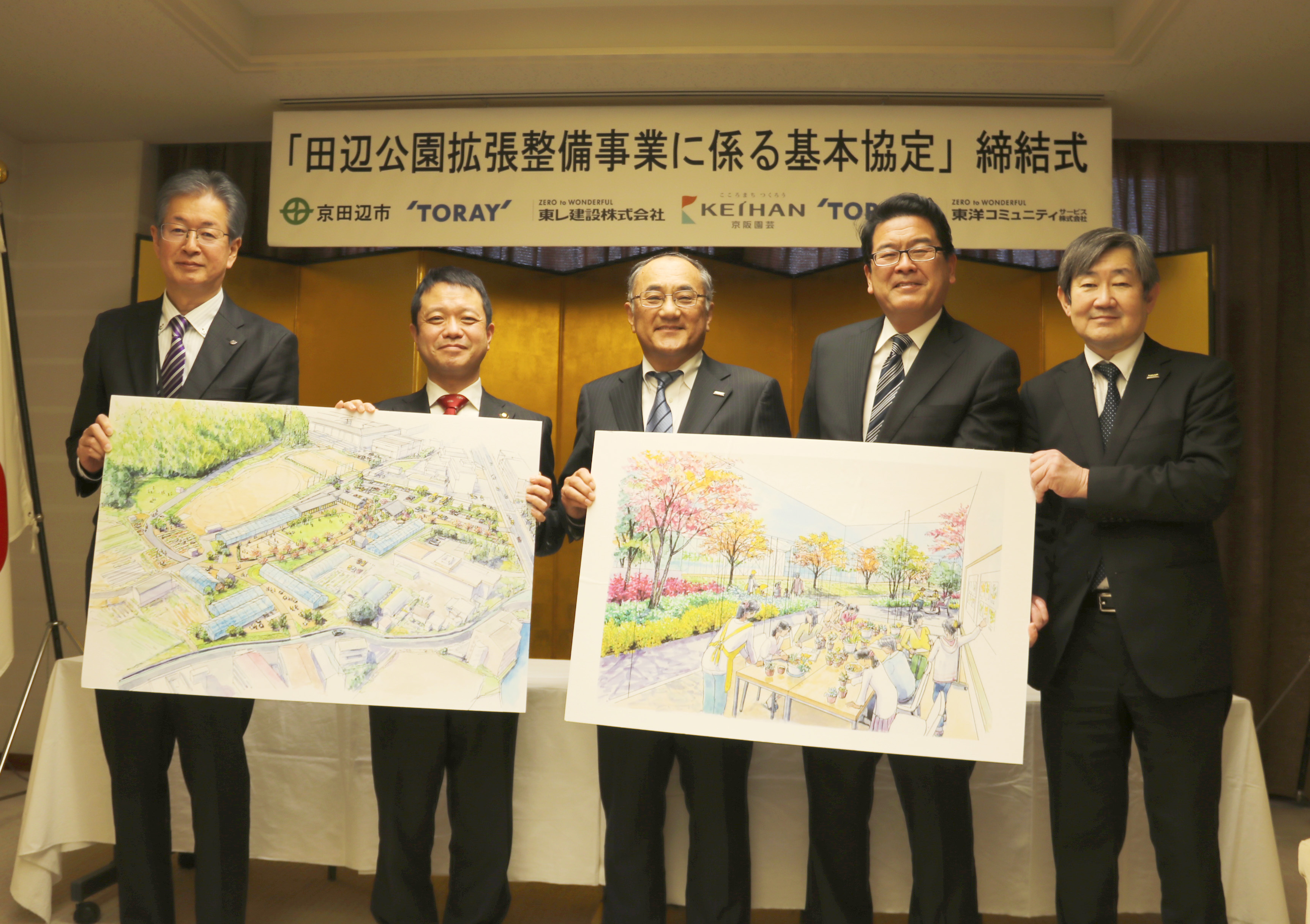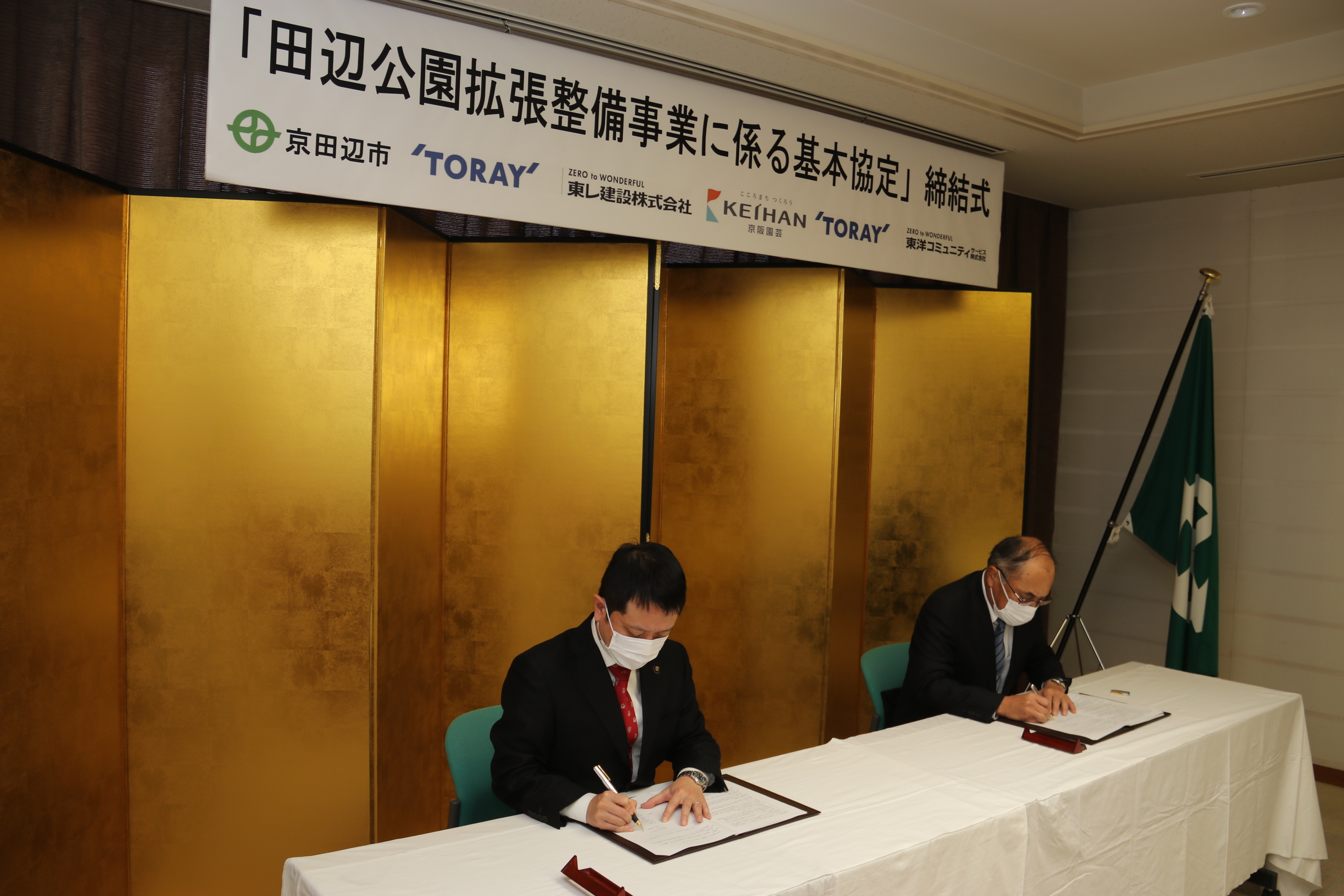田辺公園拡張整備事業に関して、京田辺市とPark-PFI事業者に選定された東レ建設グループの代表法人、構成法人との間で、令和5年2月27日に基本協定を締結しました。
