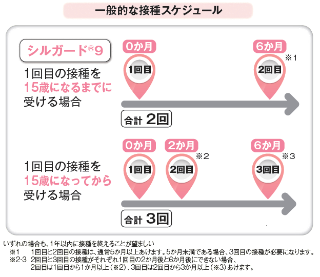 シルガード9(9価HPVワクチン)についてのみ、15歳未満で1回目を接種された場合は、5か月以上(標準的には6ヶ月)の間隔を開けて2回目の接種を受けることで完了となります。