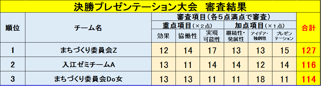 この度、これらの3チームによる「決勝プレゼンテーション大会」を開催し、4名の審査員(上村市長、市民代表、有識者2名)による審査で、「まちづくり委員会Z」が最優秀賞を受賞いたしました。