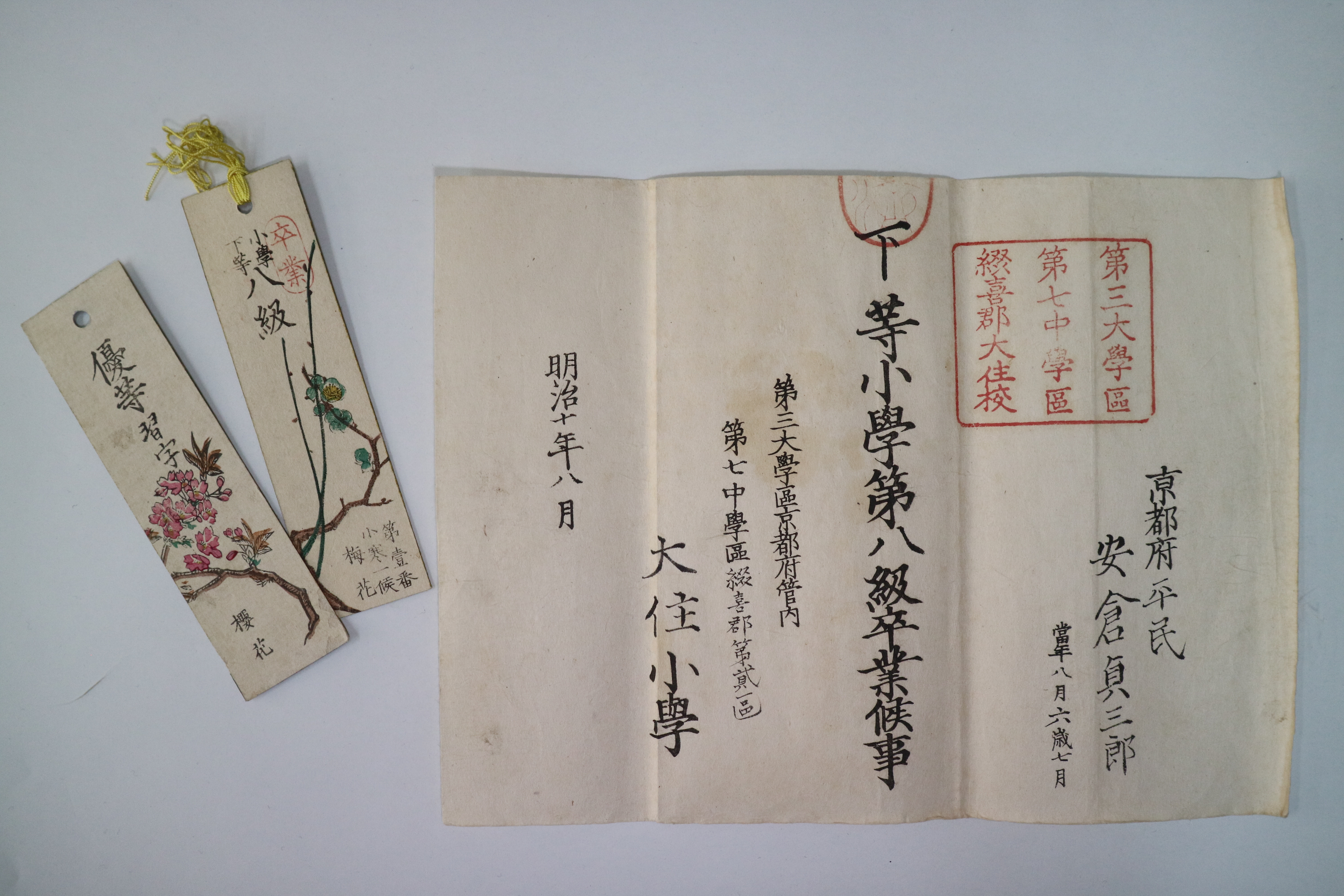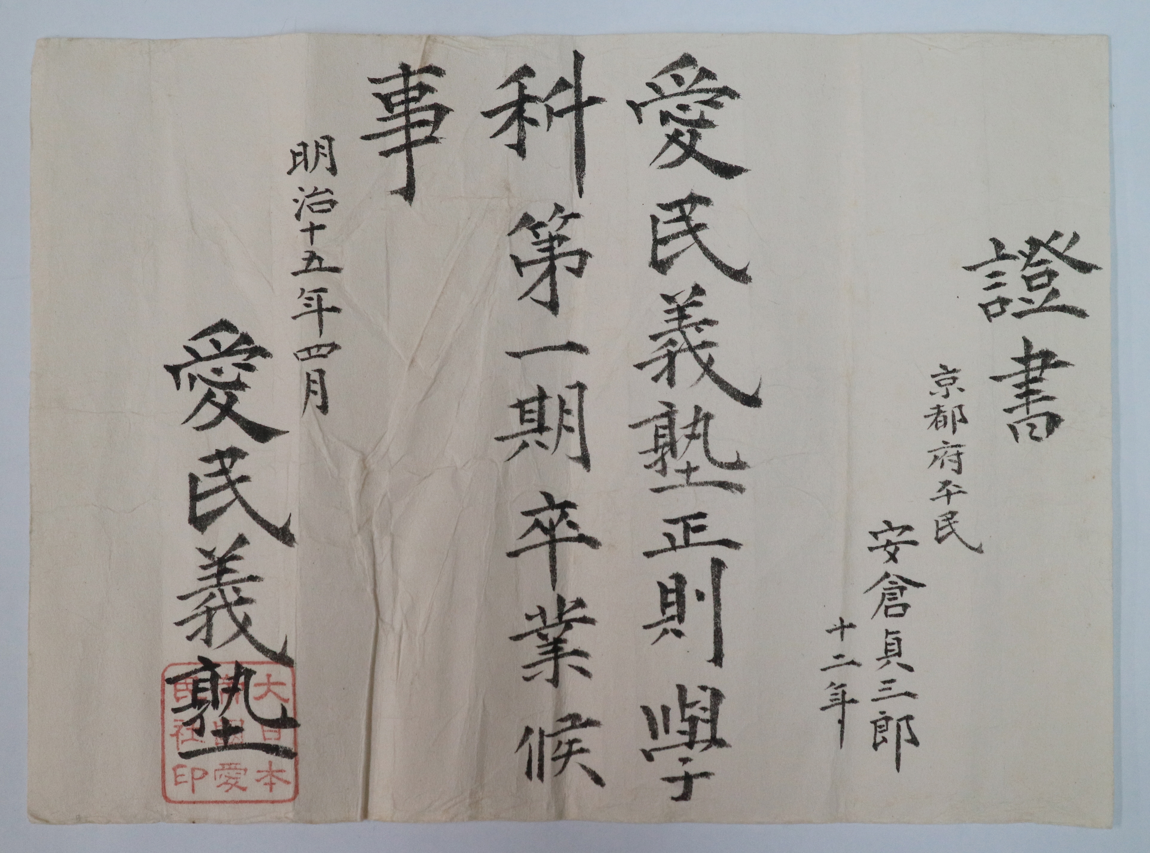 これは大住村村長などを歴任した安倉貞三郎氏の大住校(現在の大住小学校)と愛民義塾の卒業証書です。小学校を経て、愛民義塾に学んでいることがわかります。愛民義塾には普通・専門の二科が置かれ、それ以外にも夜に適宜時間を設けて、学齢の内外を問わず、学問の志のあるものには読・書・算の三課を教授しました。南山義塾と同様に、最盛期の明治16・17年(1883・1884年)には50人を超える生徒が在籍していました。