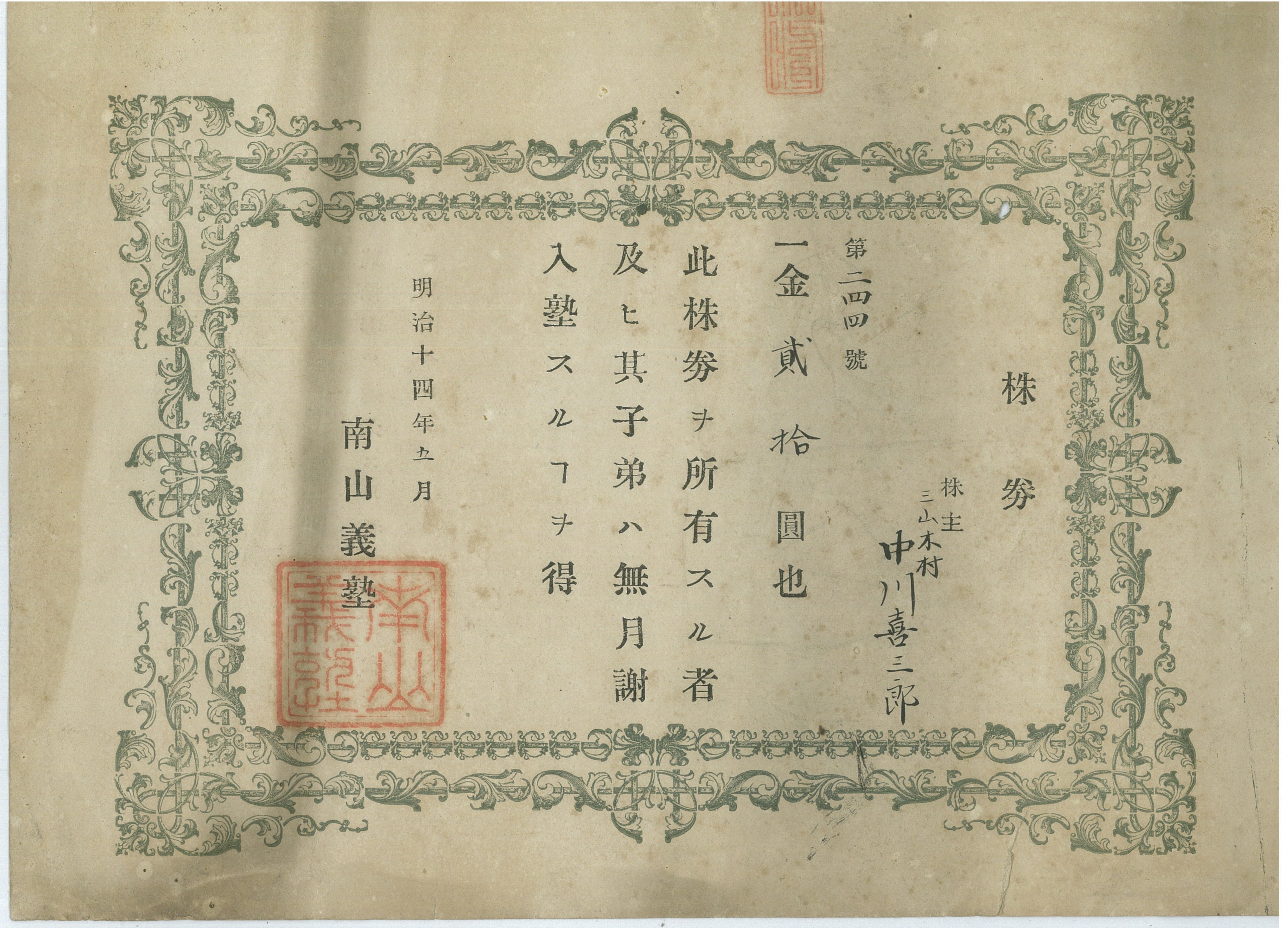 明治13年(1880年)には、京都府知事北垣国道に対して南山義塾開業願が提出されます。義塾設立のために、1株20円の南山義塾株券が発行され、187人が応募し、8,150円の資金が集められ、開業に向けて着々と準備が進められました。