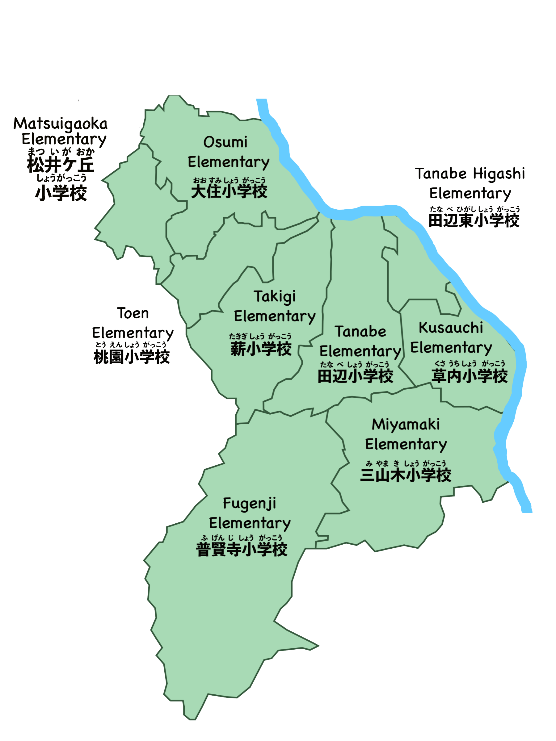| Elementary Schools 小学校(しょうがっこう) (9) | Osumi Elementary 大住小学校(おおすみしょうがっこう), Tanabe Elementary 田辺小学校(たなべしょうがっこう), Kusauchi Elemnentary 草内小学校(くさうちしょうがっこう), Miyamaki Elementary 三山木小学校(みやまきしょうがっこう), Fugenji Elementary 普賢寺小学校(ふげんじしょうがっこう), Tanabe Higashi Elementary 田辺東小学校(たなべひがししょうがっこう), Matsuigaoka Elementary 松井ケ丘小学校(まついがおかしょうがっこう), Takigi Elementary 薪小学校(たきぎしょうがっこう), Toen Elementary 桃園小学校(とうえんしょうがっこう) |