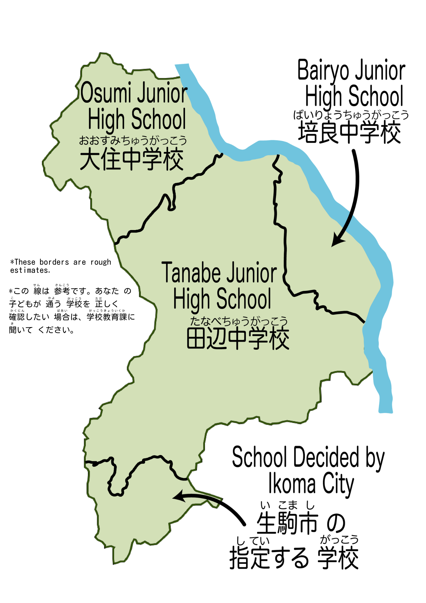| Junior High Schools 中学校(ちゅうがっこう) (3) | Tanabe Junior High 田辺中学校(たなべちゅうがっこう), Osumi Junior High 大住中学校(おおすみちゅうがっこう), Bairyou Junior High 培良中学校(ばいりょちゅうがっこう) |