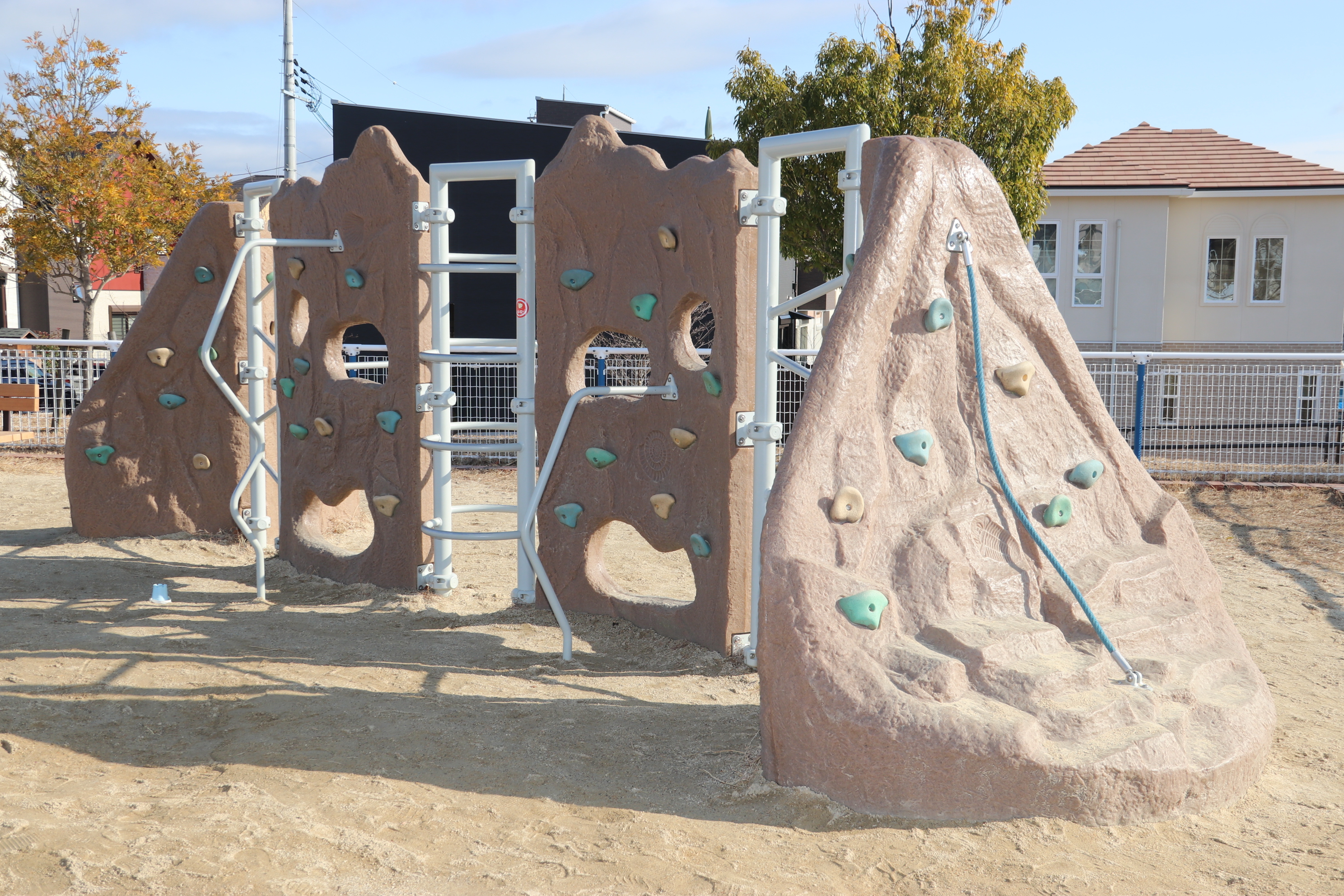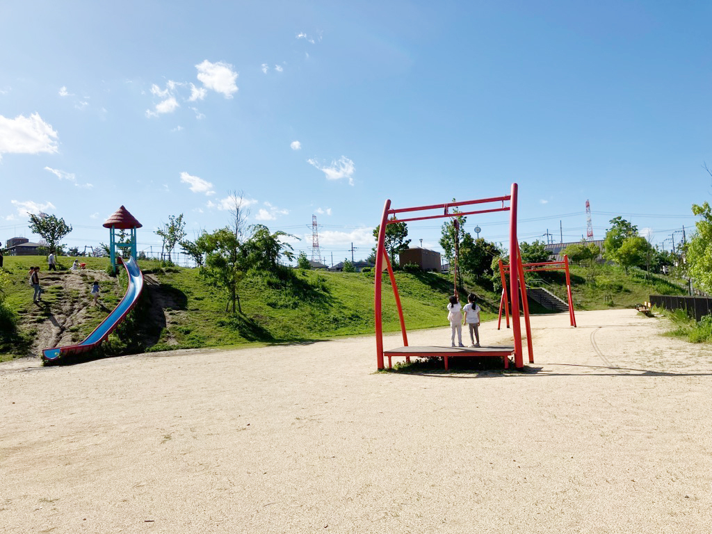 高低差のある2つの公園をロング滑り台がつないでいます。