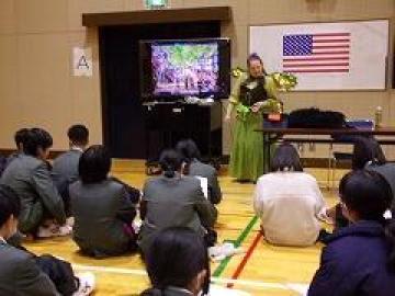 京都府名誉友好大使をお招きして各国の紹介をしてもらい、文化学習にも取り組んでいます。