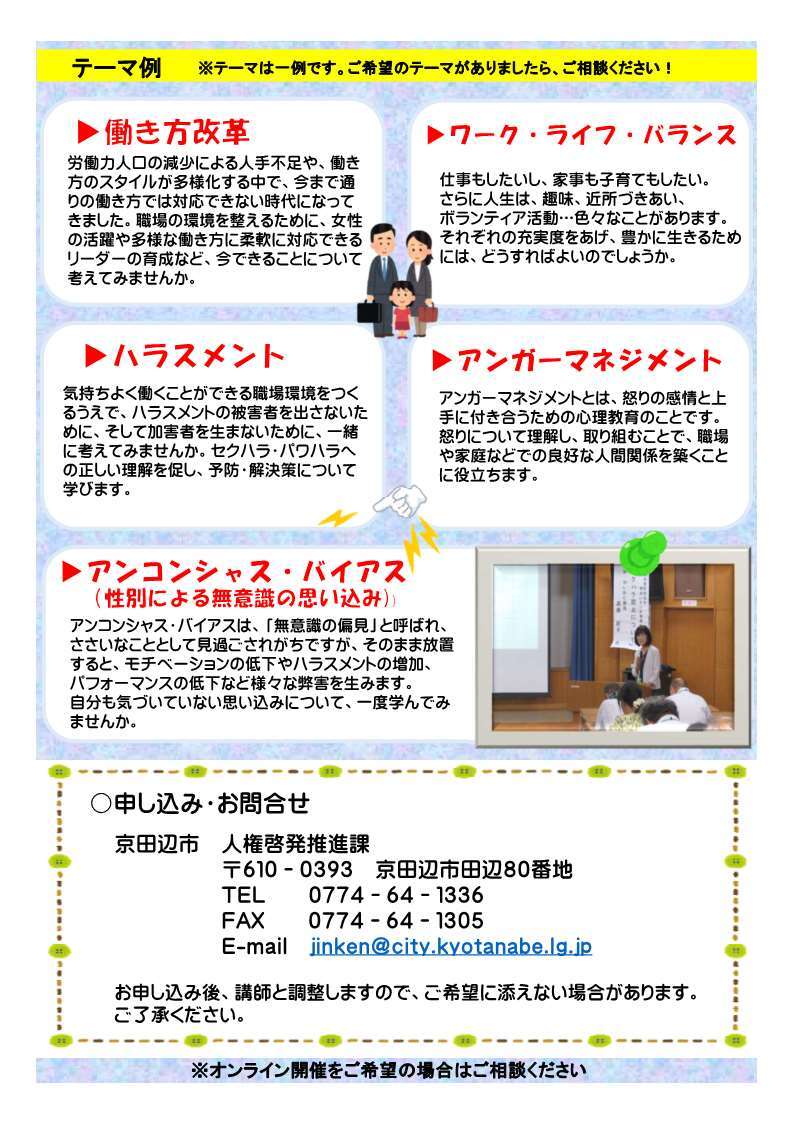 「京田辺市男女共同参画推進員」を登録していただいた事業所等において、男女共同参画に関連したテーマの社員向けセミナー(研修)を開催する際に、無料で講師の派遣を受けることができます。