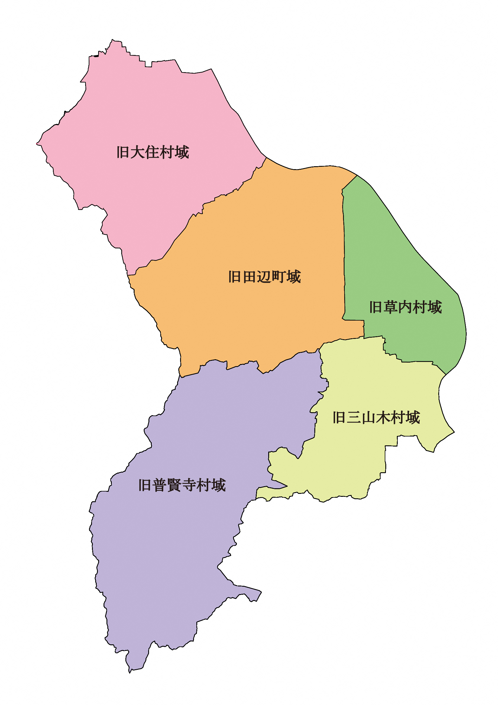 現在の京田辺市は、大住、田辺、草内、三山木、普賢寺と大きく5つの地域に分けて語られることがあります。この5地域は、大住村、田辺町、草内村、三山木村、普賢寺村というように、元々はそれぞれ独立した地方自治体でした。この1町4村が、昭和26年(1951年)に合併して、現在とほぼ同様の区域を持つ田辺町が誕生し、現在に至ります。