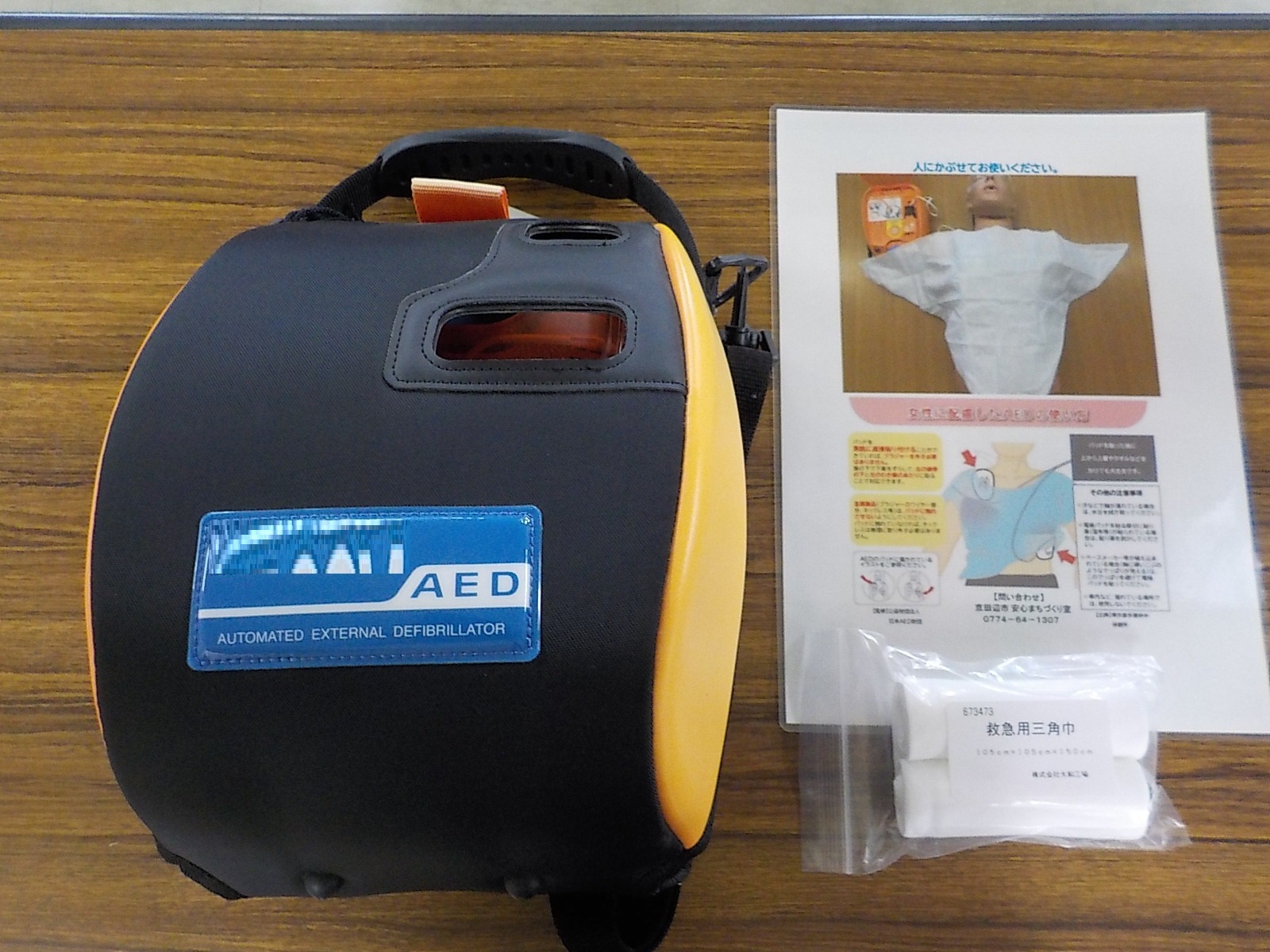京田辺市では、市が管理するAEDボックス内に、いざという時に倒れている方のプライバシーを守り、使用する方がためらうことなくAEDを使用できるように、三角巾と使い方のリーフレットを設置しました。リーフレットには、服を脱がさずにAEDパッドを貼る方法や、三角巾を使ったプライバシーを保護する使用方法が記されています。