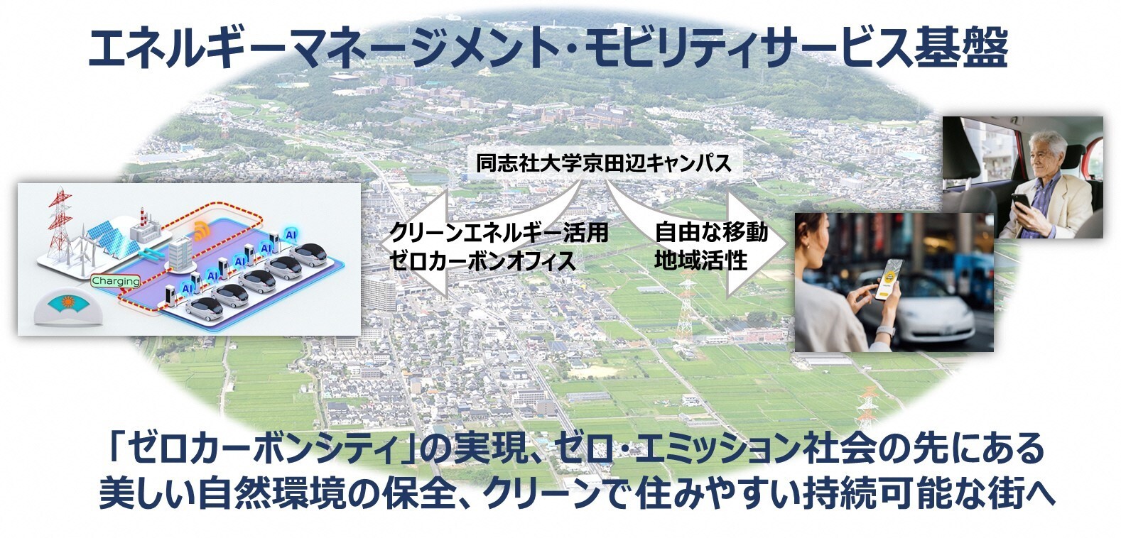 同志社大学の学長である小原克博は、「同志社大学は先端的な教育・研究の成果を地域社会に還元することによって、地域社会の活性化のための中核的な役割を果たしたいと考えています。また本学は、地球環境の持続的な発展に寄与する先駆的なサステナブル・キャンパスを創ることを目標としています。今回の3者連携協定は、本学がこれまで取り組んできたモビリティとエネルギーマネージメントに関係する研究を、日産自動車と提携することによりさらに発展させ、その成果を本学の京田辺キャンパスが位置する京田辺市において社会実装することを目指すものとなります」と述べました。