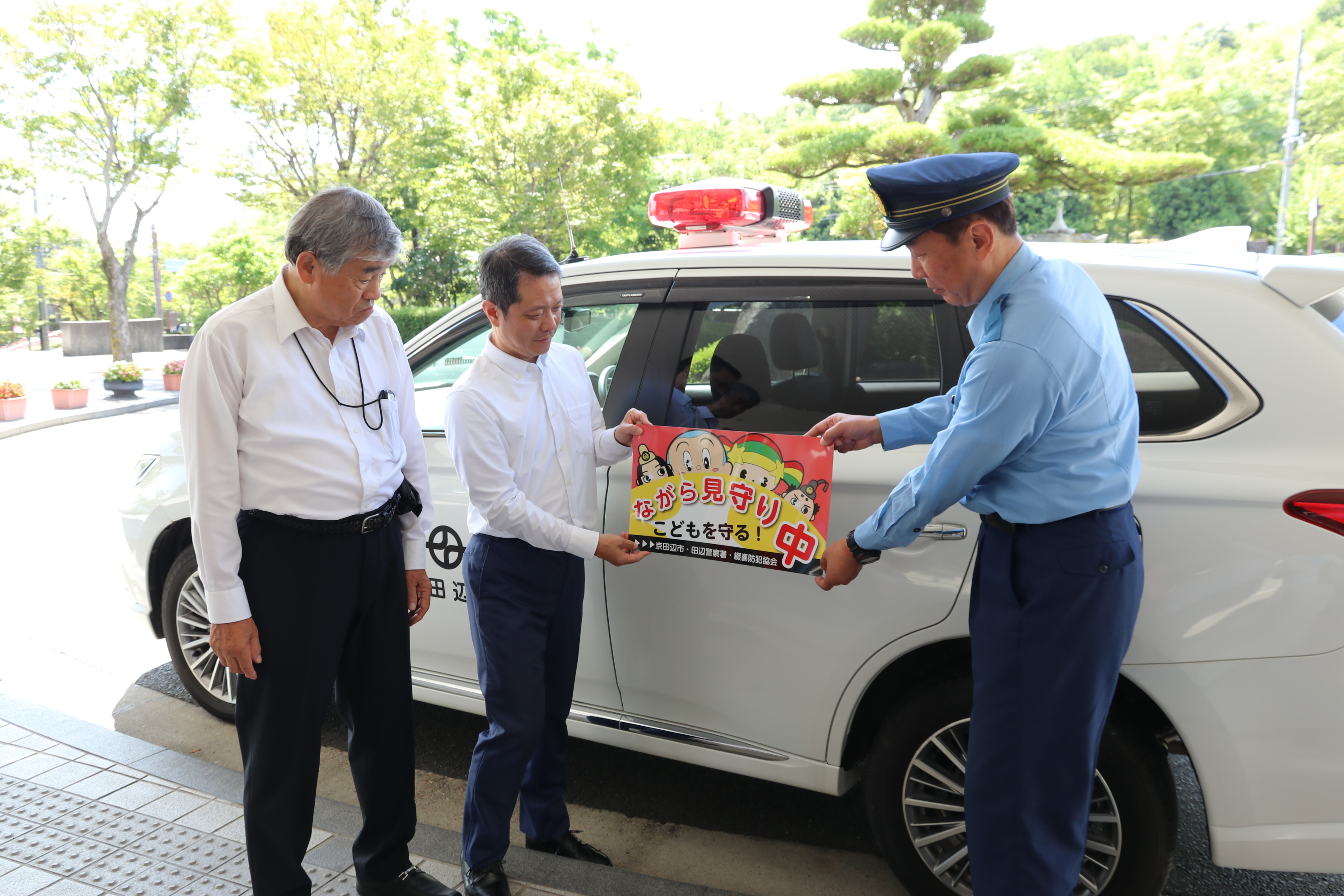 牧草綴喜防犯協会会長、上村市長、永野田辺警察署長(左より)