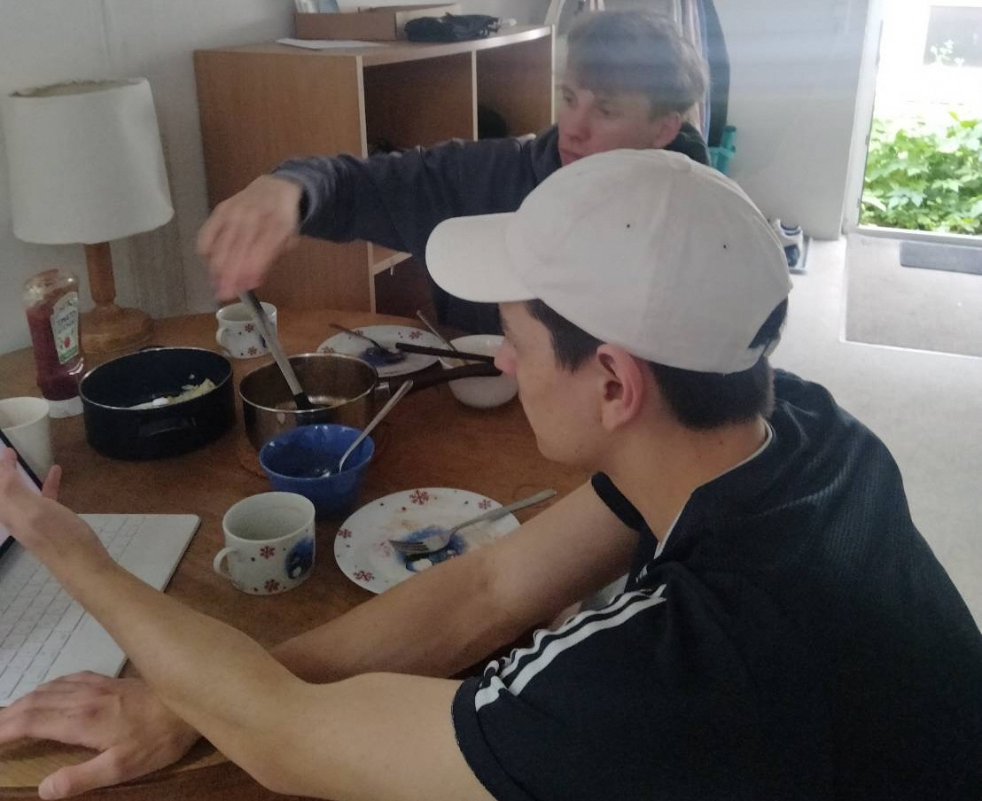 ドイツの友人と家で食事をしながら動画を見ている