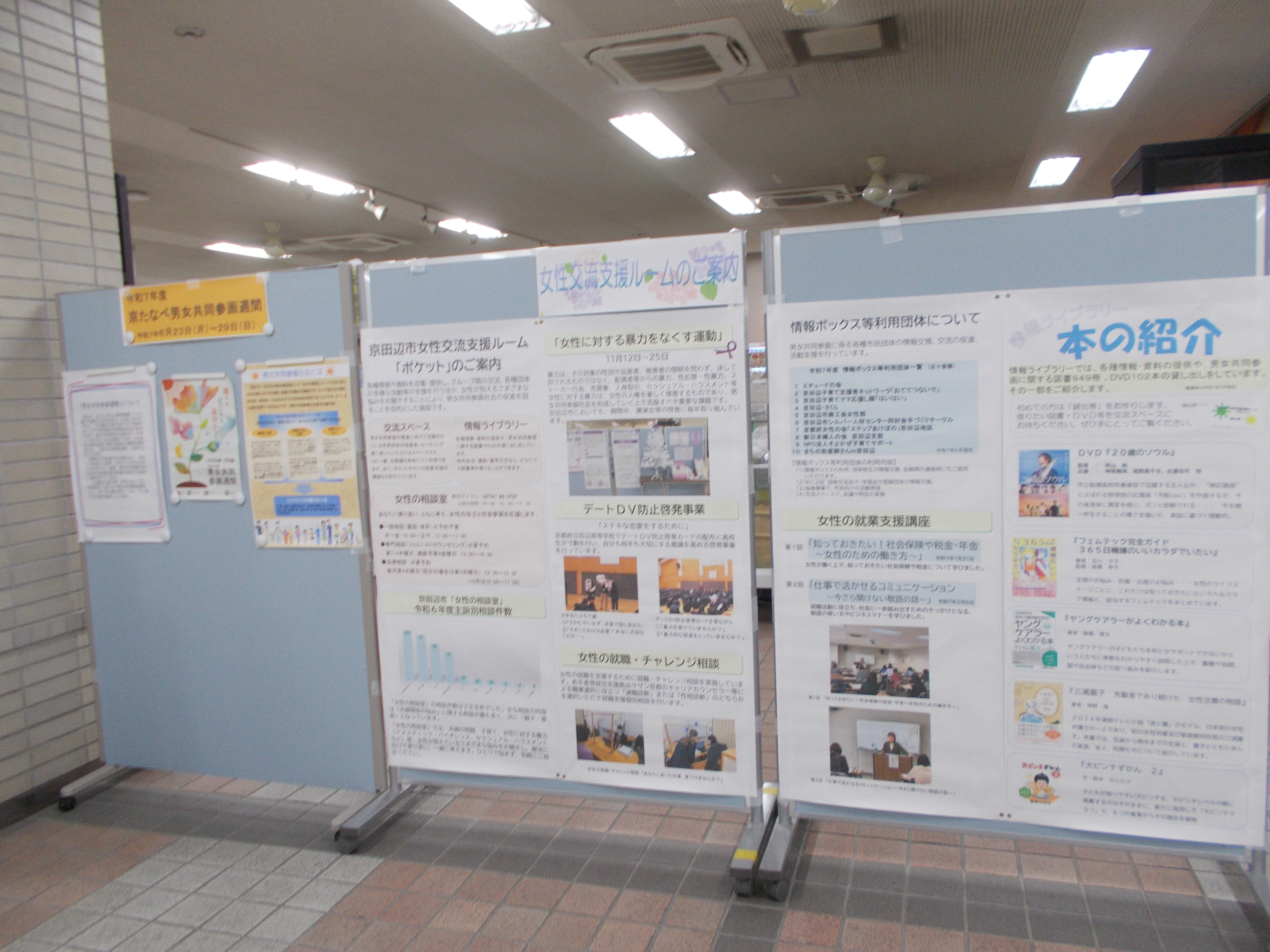 男女共同参画の視点から、さまざまな分野で活躍する方を紹介する『個性キラリ☆自分流』や、「男女共同参画の現状」について、また「京田辺市女性交流支援ルーム」を紹介するパネル展を行いました。