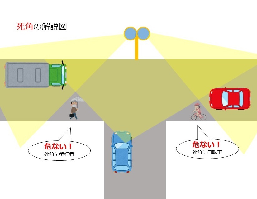 カーブミラーには下図のように死角ができるというデメリットがあります。歩行者・自転車・二輪車にとってはかえって危険になってしまいます。