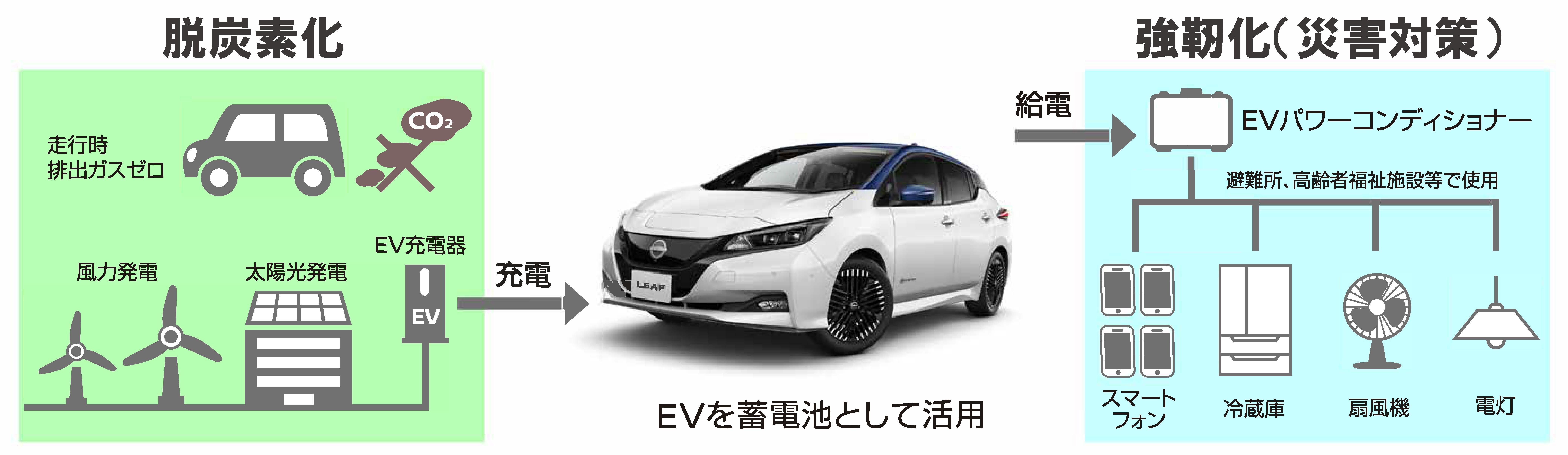 - 京田辺市で災害を起因とする停電が発生した際、京都日産自動車の販売店舗に配備しているEVを無償貸与し、避難所等の非常用電源として活用する。