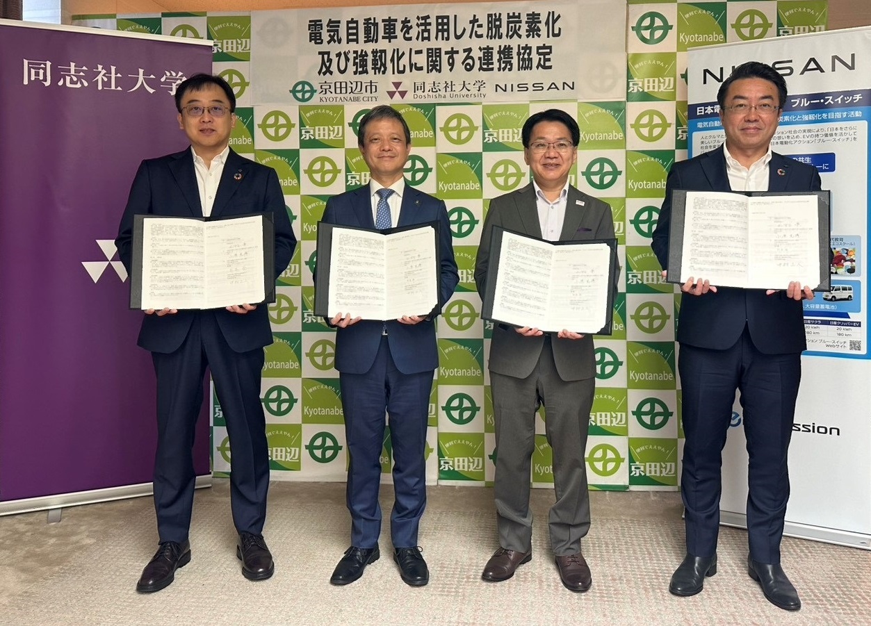京都府京田辺市と学校法人同志社 同志社大学、日産自動車株式会社、京都日産自動車株式会社の4者は3日、脱炭素社会の実現と災害対応に関し電気自動車(EV)を活用する「脱炭素化及び強靭化に関する連携協定」を締結しました。