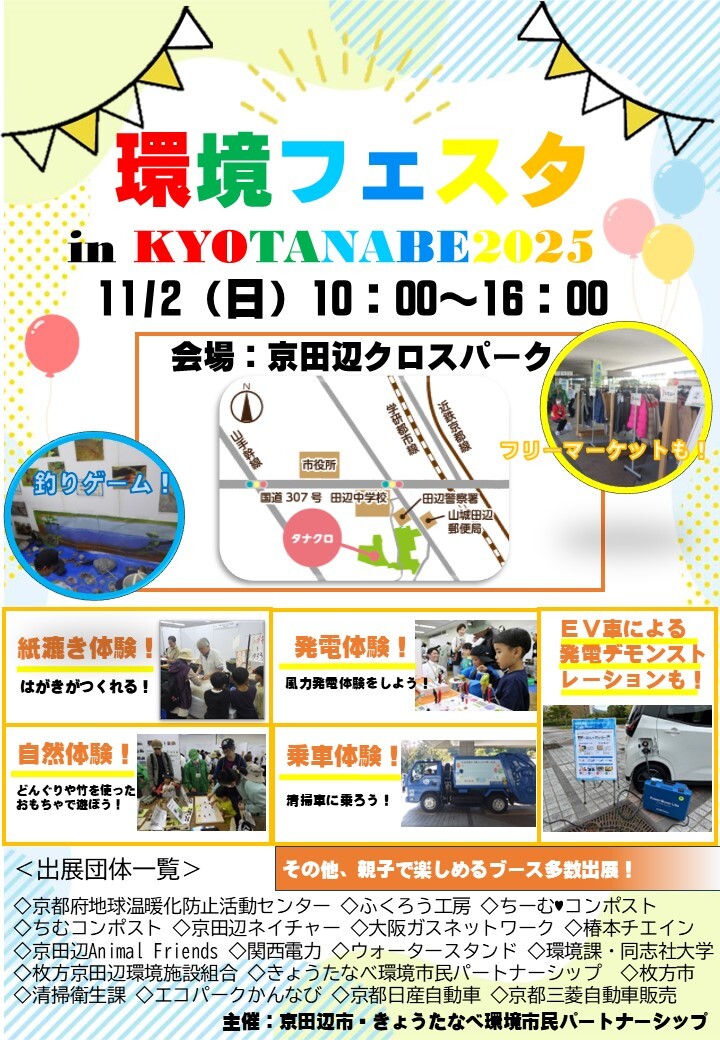 幅広い世代にイベントを通して、楽しみながら環境について考えてもらい、ゼロカーボンシティ実現の推進や京田辺市の「豊かな環境」を未来につなぐ人の輪を広げることを目的に環境フェスタを開催しました。