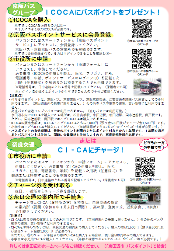 ・付与されるポイントは、京阪バス・京都京阪バス・京阪京都交通・江若交通の路線バス運賃としてのみ利用できます。(京田辺市内の乗車に限りません。)その他のバスや電車、買い物等には利用できません。