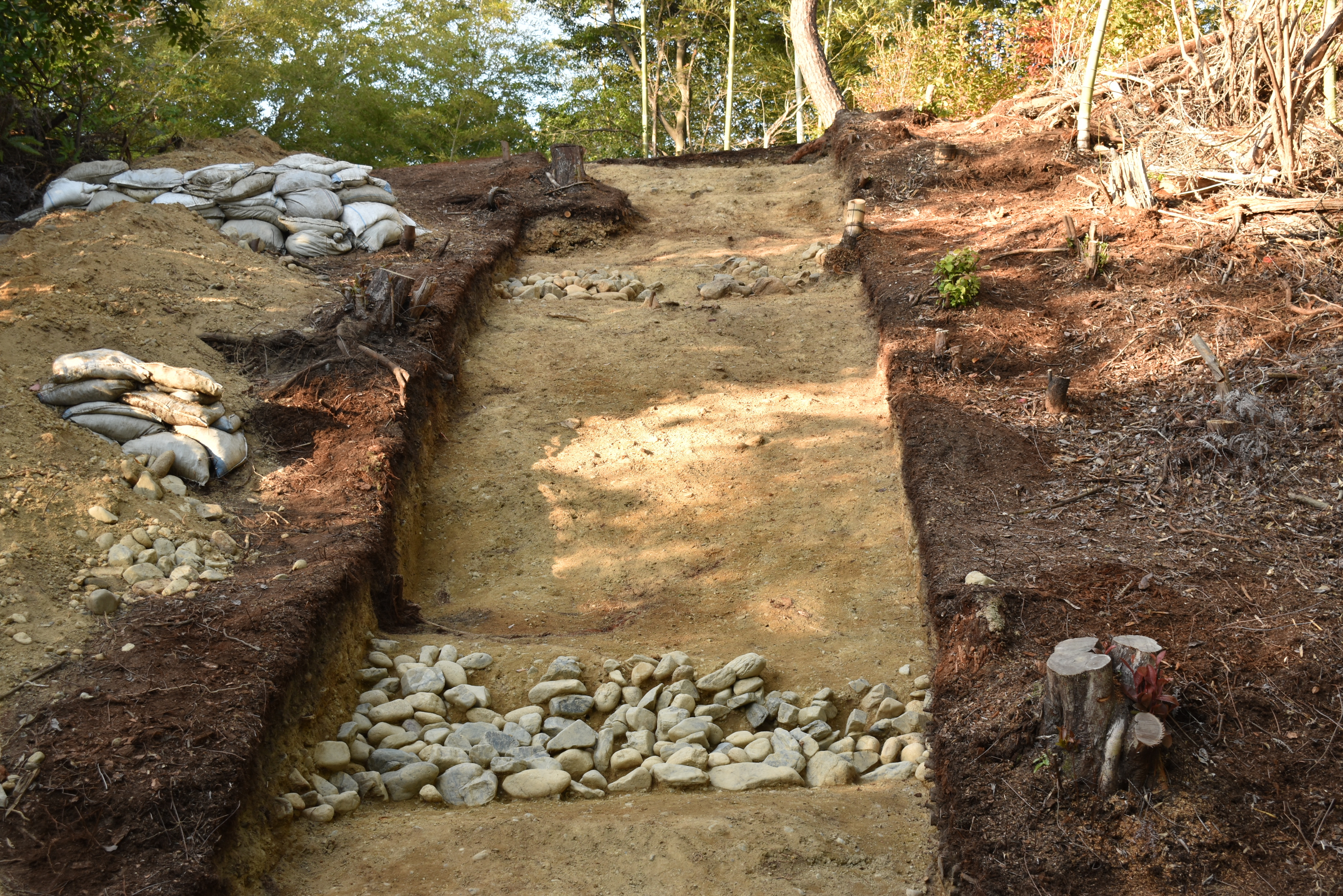 今回の発掘調査では前方後円墳の前方部において、北側と南側の斜面を初めて調査し、古墳の斜面を約8.5mにわたって検出しています。