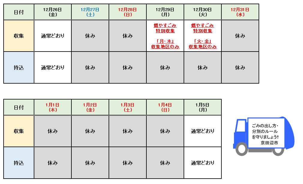 ※ 12月29日(月曜日)は、燃やすごみの「月・木」収集地区を対象とした特別収集のみで、環境衛生センター甘南備園へのごみの持込みはできません。