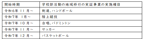 また、令和9年度以降は、平日の学校部活動の地域クラブ活動への移行に向けて、検討・検証を行うため、平日の学校部活動において地域クラブ活動の実証事業を実施する予定をしています。