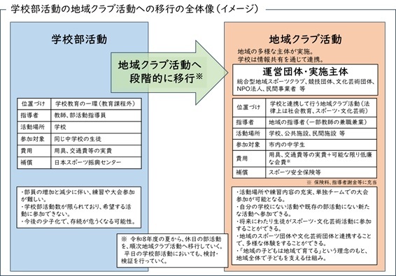 まずは、令和8年度夏以降に、休日の学校部活動を地域クラブ活動へと順次移行することを目指しています。また、平日の学校部活動においても、休日の活動と同様に、検討・検証を行っていきながら、活動体制を整え、地域クラブ活動へと順次移行していくこととします。