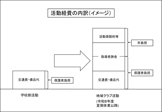 費用については、ガイドラインに、「運営団体・実施主体は、生徒や保護者、地域住民等の理解を得つつ、活動の維持・運営に必要な範囲で、可能な限り低廉な会費を設定すること。」と記載しています。具体的な金額等は、今後、国の動向を踏まえて決定していきます。また、学校部活動と同様に、個人の道具や交通費等は実費として、会費とは別途必要になります。