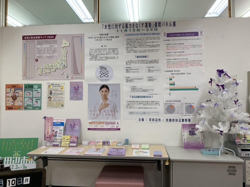 この運動期間中、女性に対する暴力根絶の機運の高まりを目的として、京都府田辺警察署との共同により、各種関係機関と連携、協力し、街頭啓発・啓発講演会・パネル展を行いました。