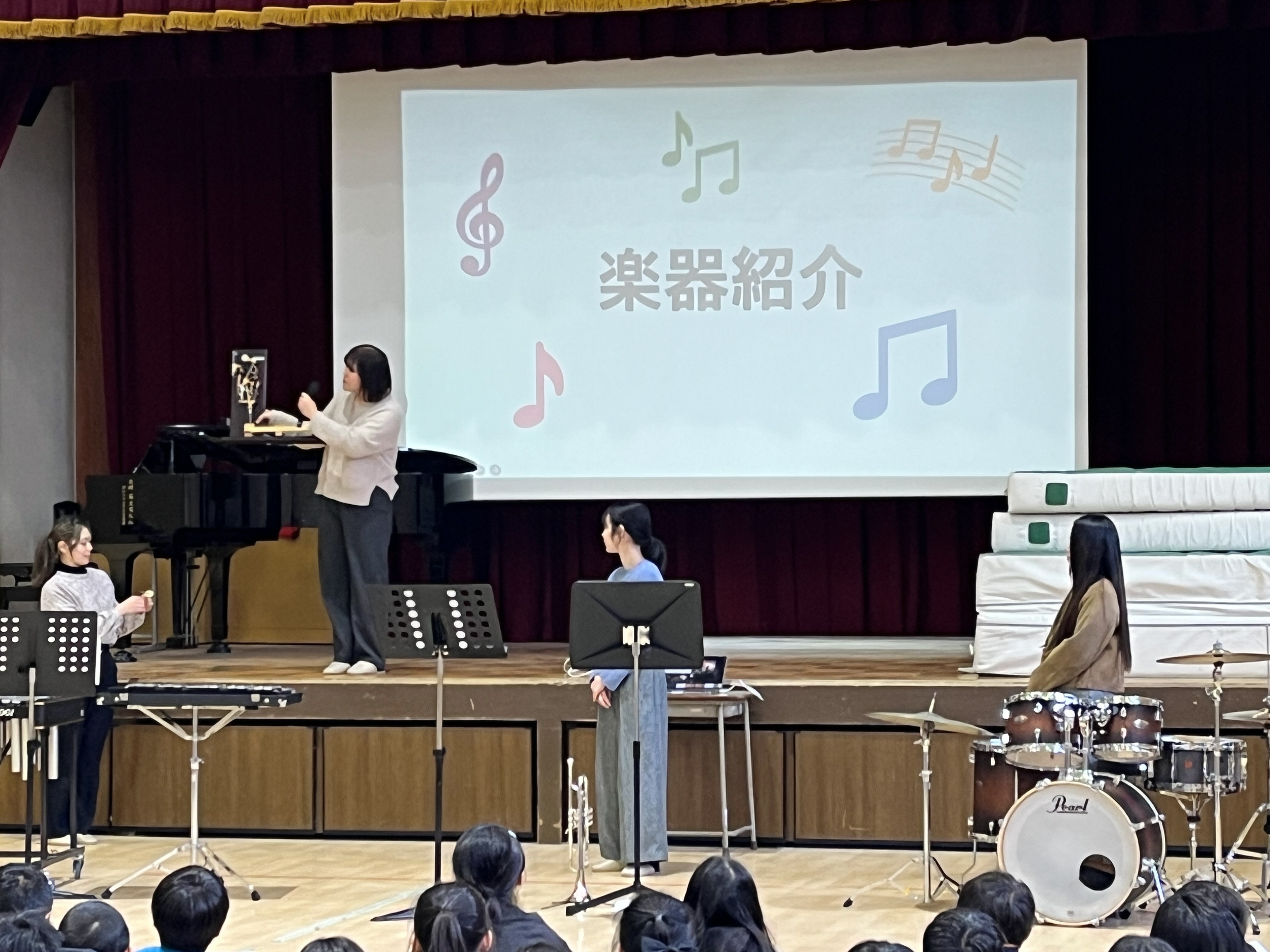 各グループが体育館と音楽室に分かれて実施し、楽器紹介やクイズを楽しんでいる様子が見られました。