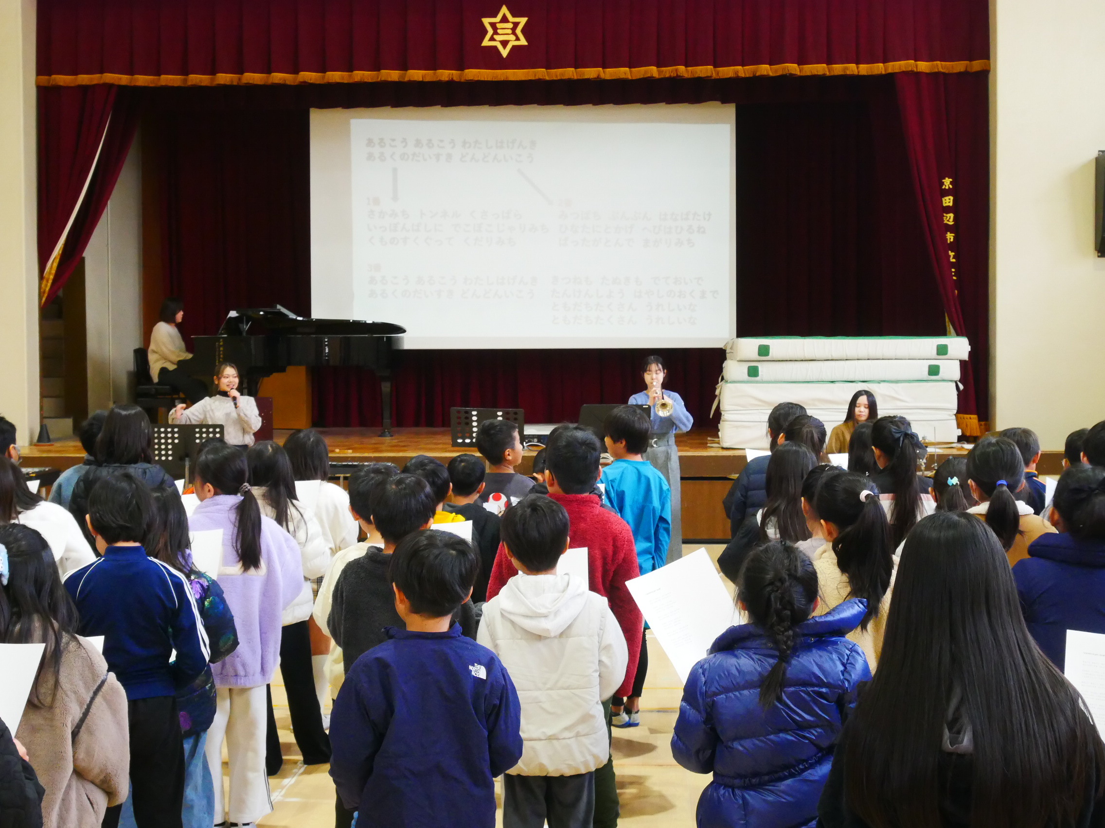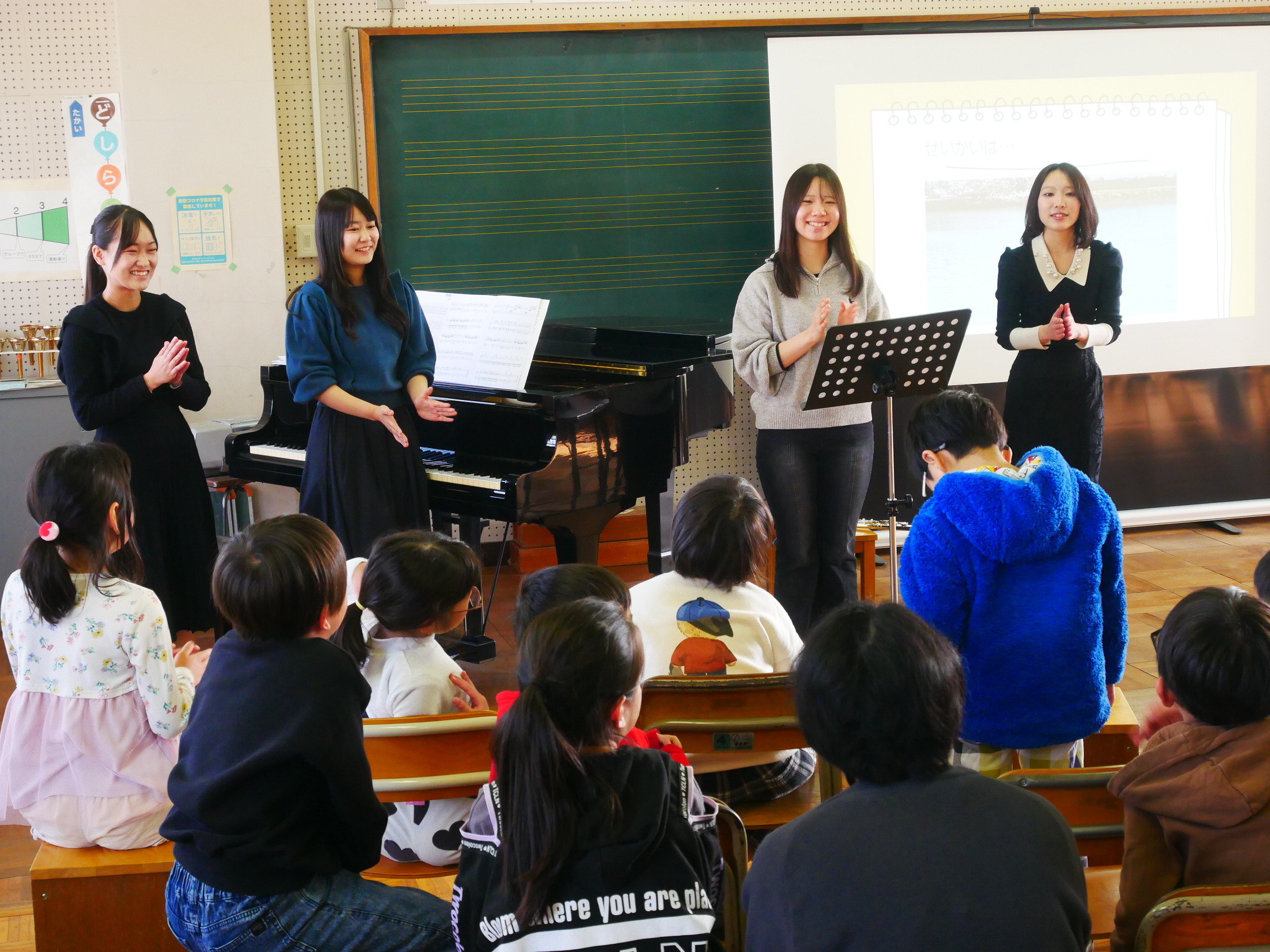 「音楽によるアウトリーチ」では、企画から開催までの一連の流れを学生自身で考えることを目標にしており、三山木小学校・普賢寺小学校の2校を訪問しました。
