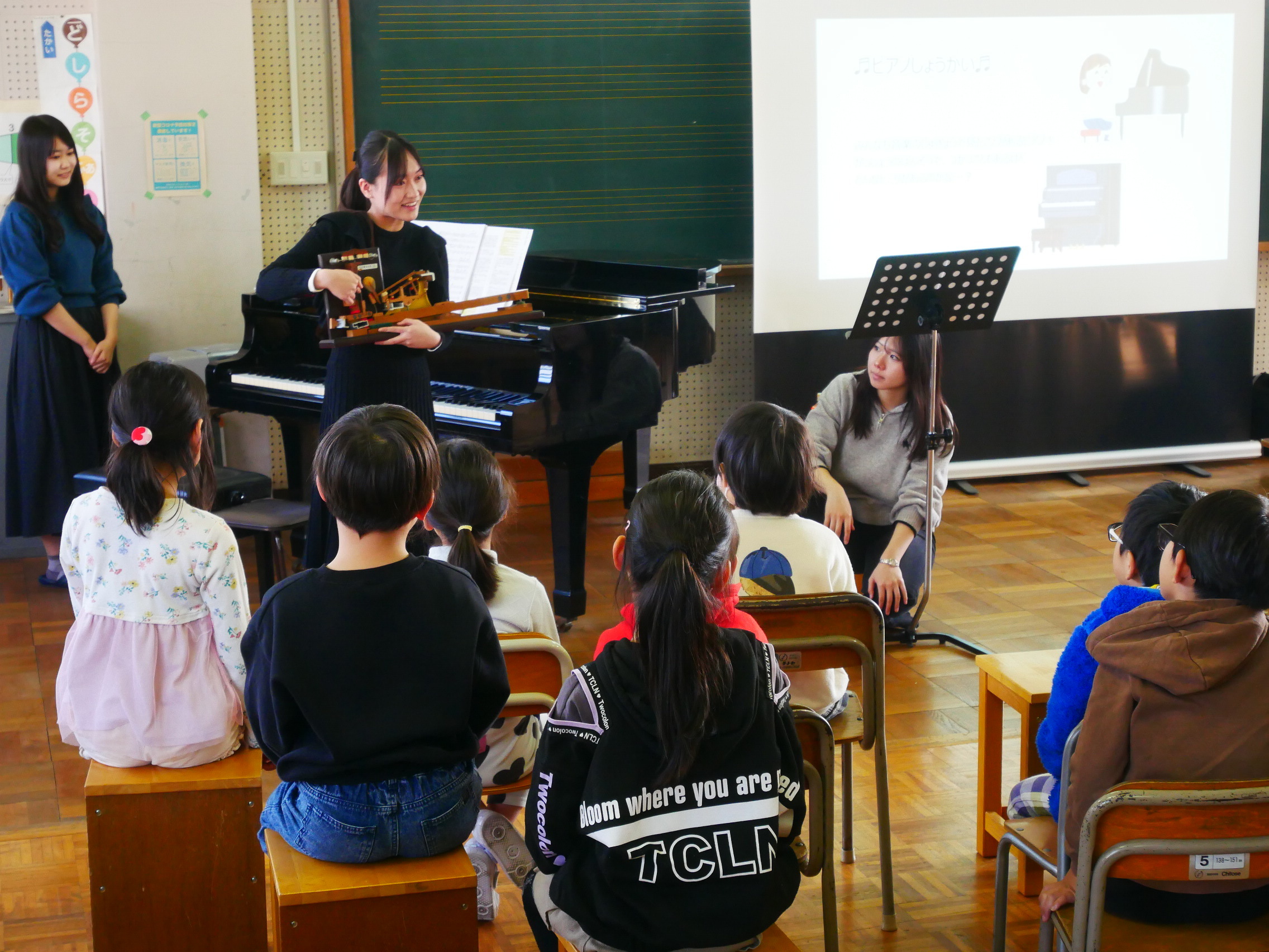 各グループが多目的室と音楽室に分かれて実施し、どの学年でも楽しめるような楽器紹介やクイズで、児童たちが楽しそうに参加していました。