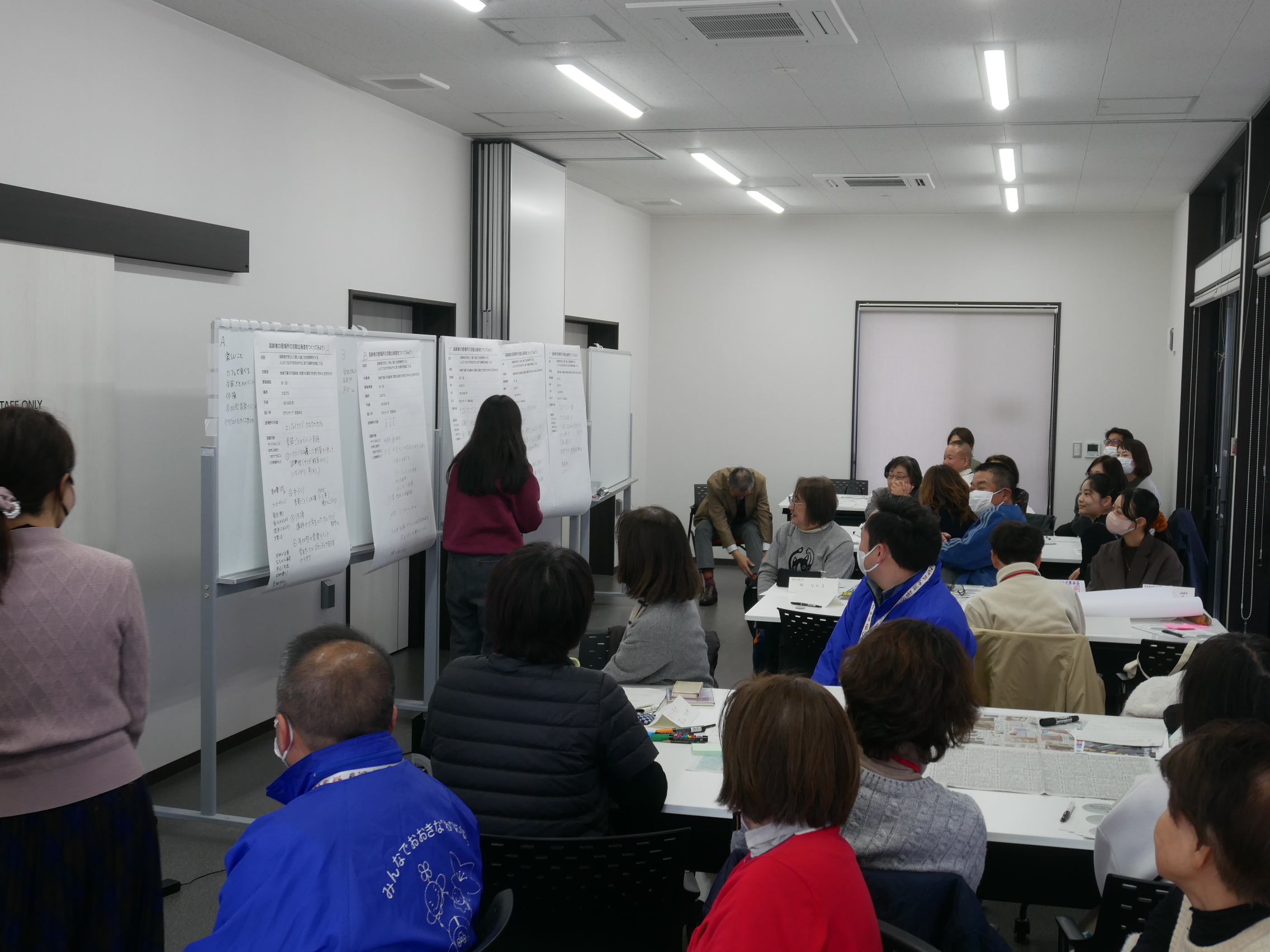 その後、11月4日(火曜日)には、京田辺クロスパーク(通称:タナクロ)にて第1回目の地域ケア会議が開催されました。この会議では、タナクロで多世代交流を促進するため、趣味や遊びなど高齢者の居場所づくりの活動について、グループで話し合いました。その中で、学生が市職員や地域のボランティアの方々などと活発な意見交換を行い、新しいアイデアが生まれました。