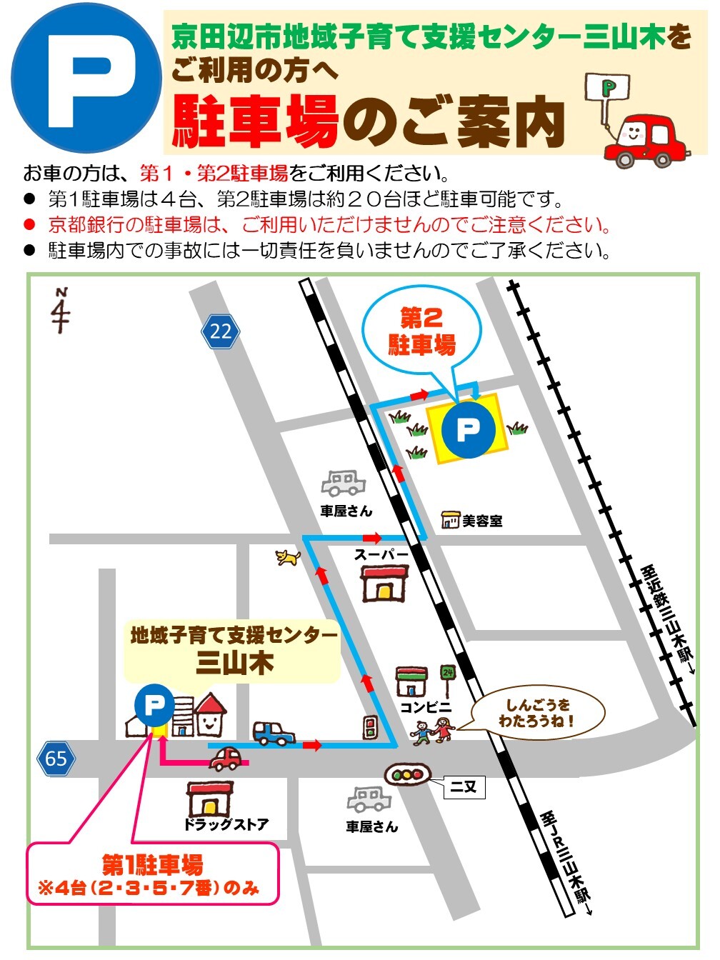 地域子育て支援センター三山木の駐車場は「第1駐車場」(4台)と「第2駐車場」(20台程度)をご利用ください。